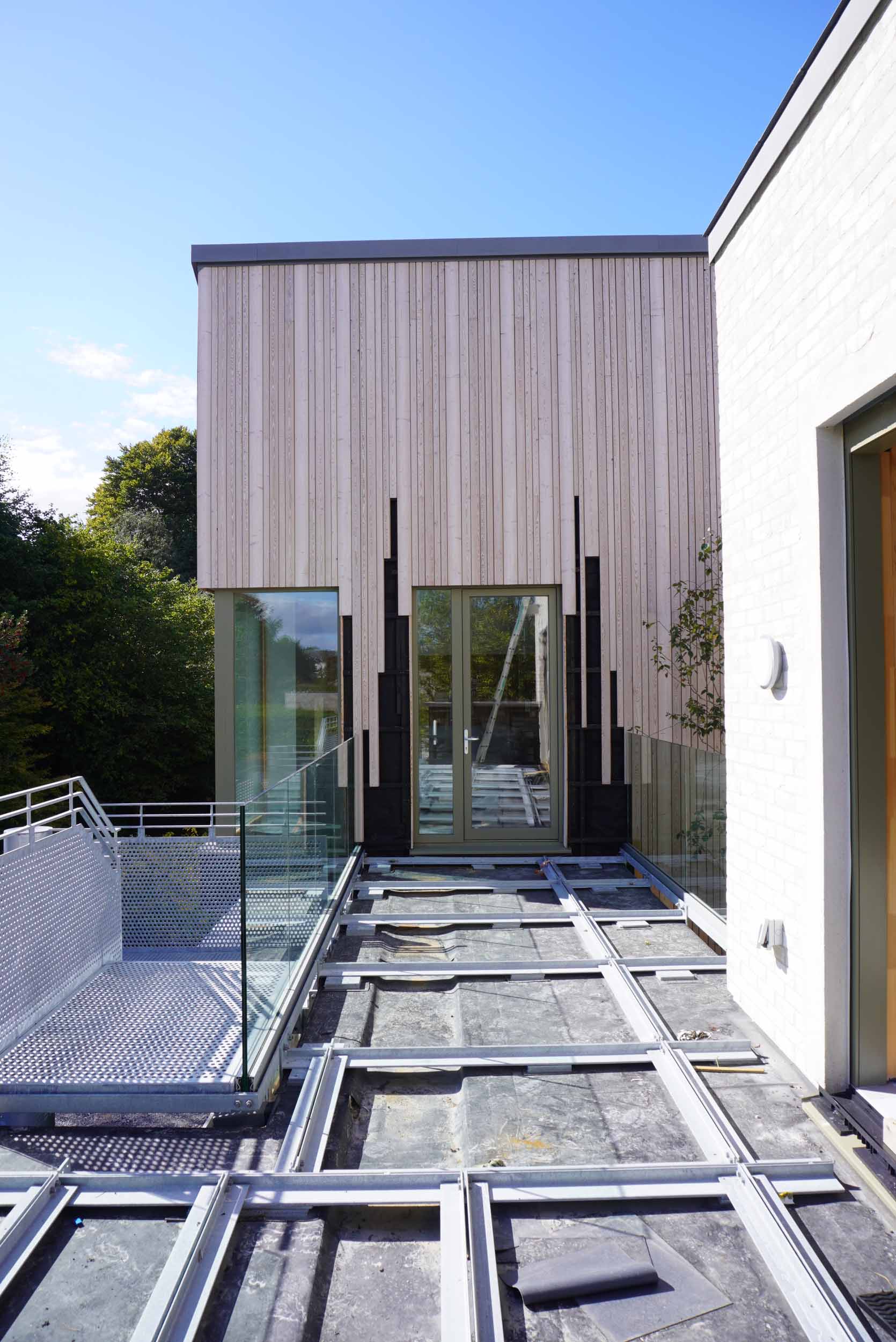 Flat roof: Sarnafil G410 PVC membrane over, 190 mm Xtratherm Thin-R TR/MG tapered flat roof insulation (thermal conductivity = 0.024W/ mK), Sarnavap 5000e AVCL adhered to 18 mm plywood, 219 mm open web joists full filled with Knauf Loft Roll 44 insulation (thermal conductivity = 0.032W/mK), Siga Majpell (airtight layer) with 15 mm Gyproc Wallboard internally. U-value: 0.081 W/m2K