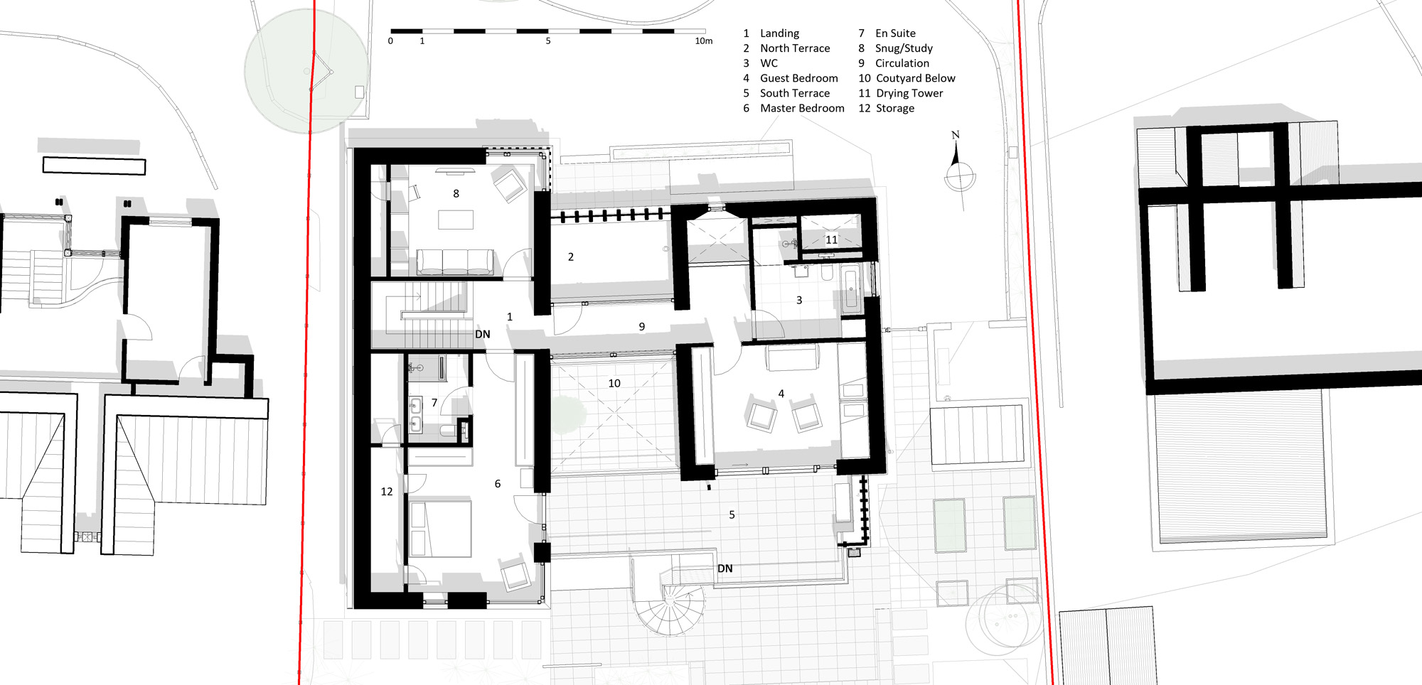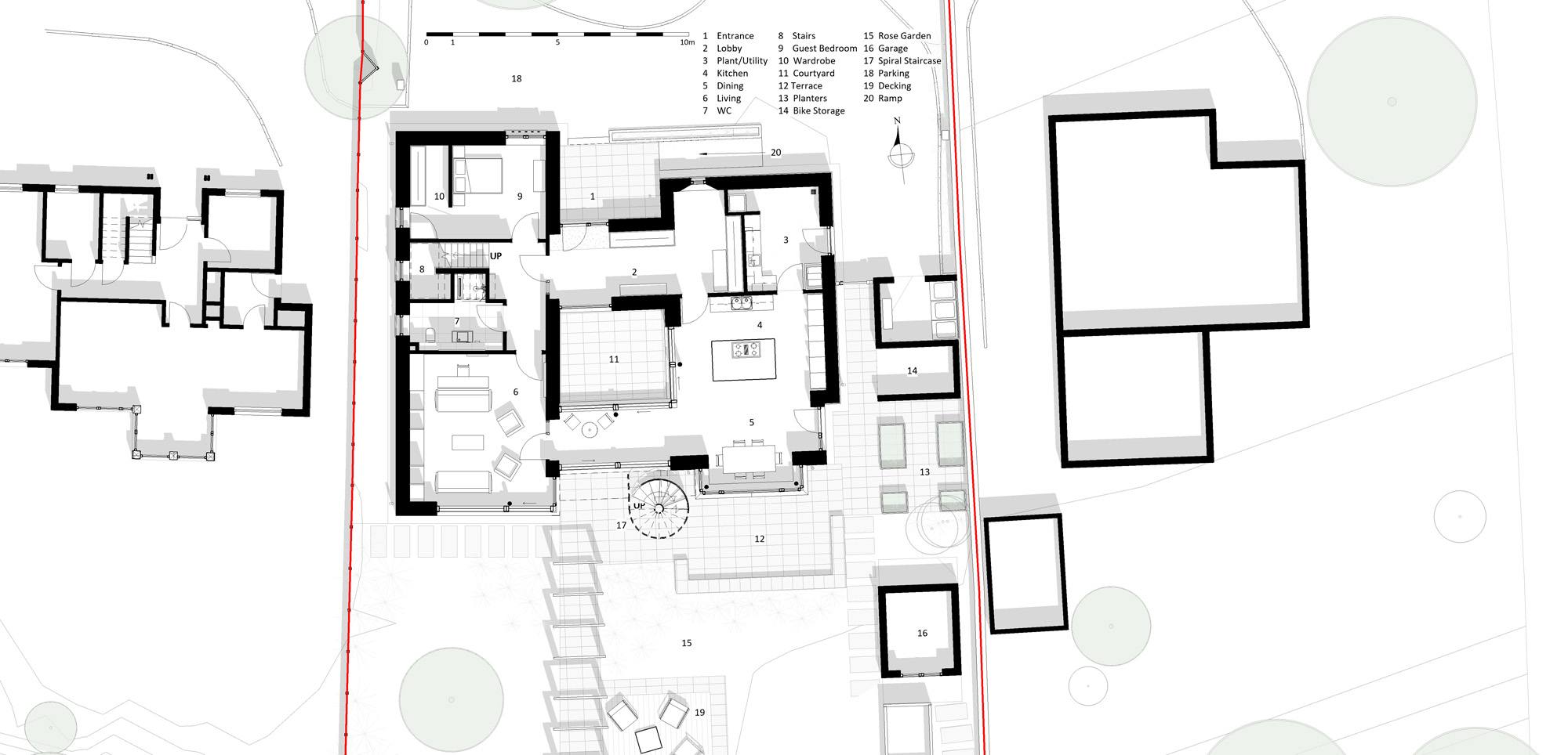 With its north-facing façade, a back garden that rises steeply at the rear, and lots of mature vegetation, getting more light into the house was a priority. For the northern rooms and terracing, this was achieved by introducing a glazed courtyard into the core of the dwelling, with vertical features to draw light down. Maeve Hurley took on the role of finishing the design of the courtyard and selecting a tree to plant at its centre.