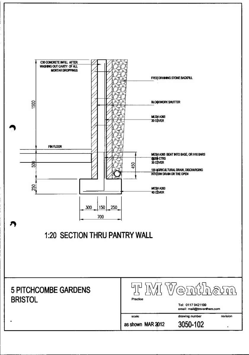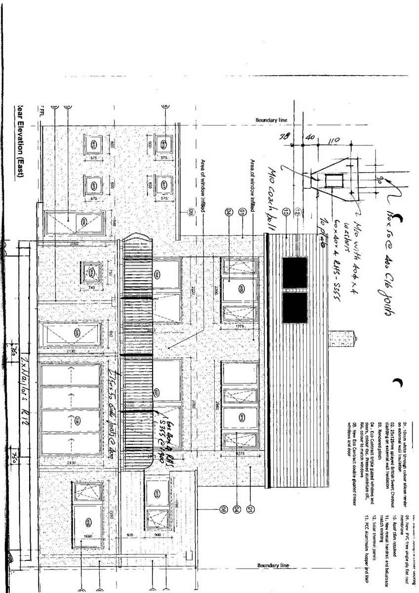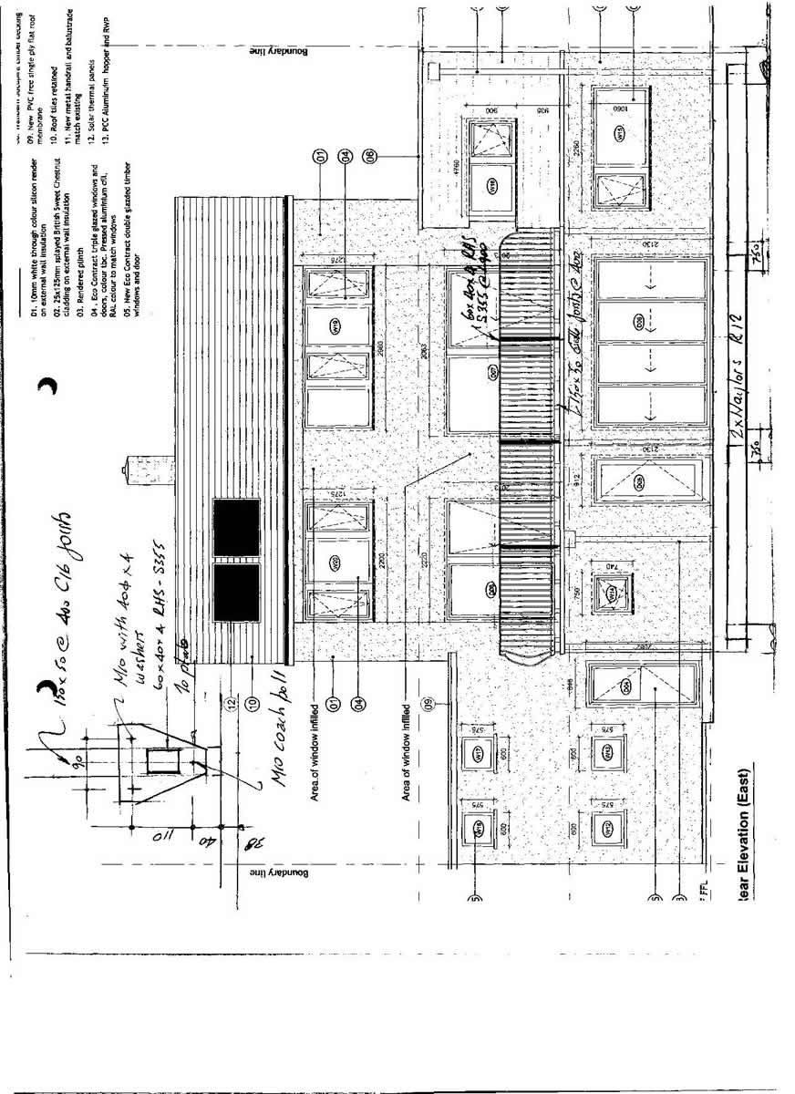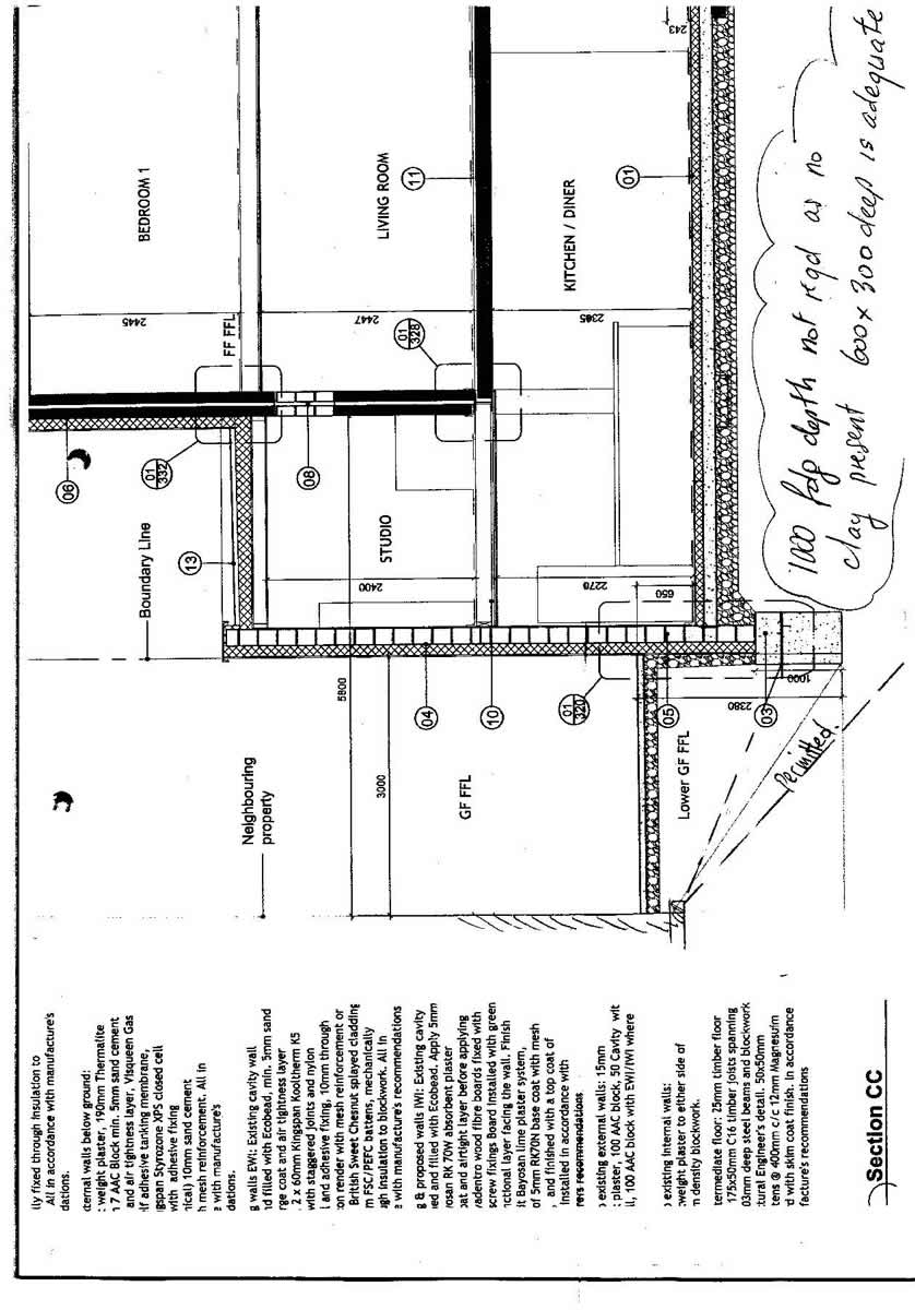 Internal wall insulation applied in some areas where special restrictions limited the ability to continue external insulation (e.g. south wall section on lower ground fl oor). Internal wall insulation used instead, limited to 100mm + cavity wall insulated with Ecobead. U-value: 0.17 W/2mK