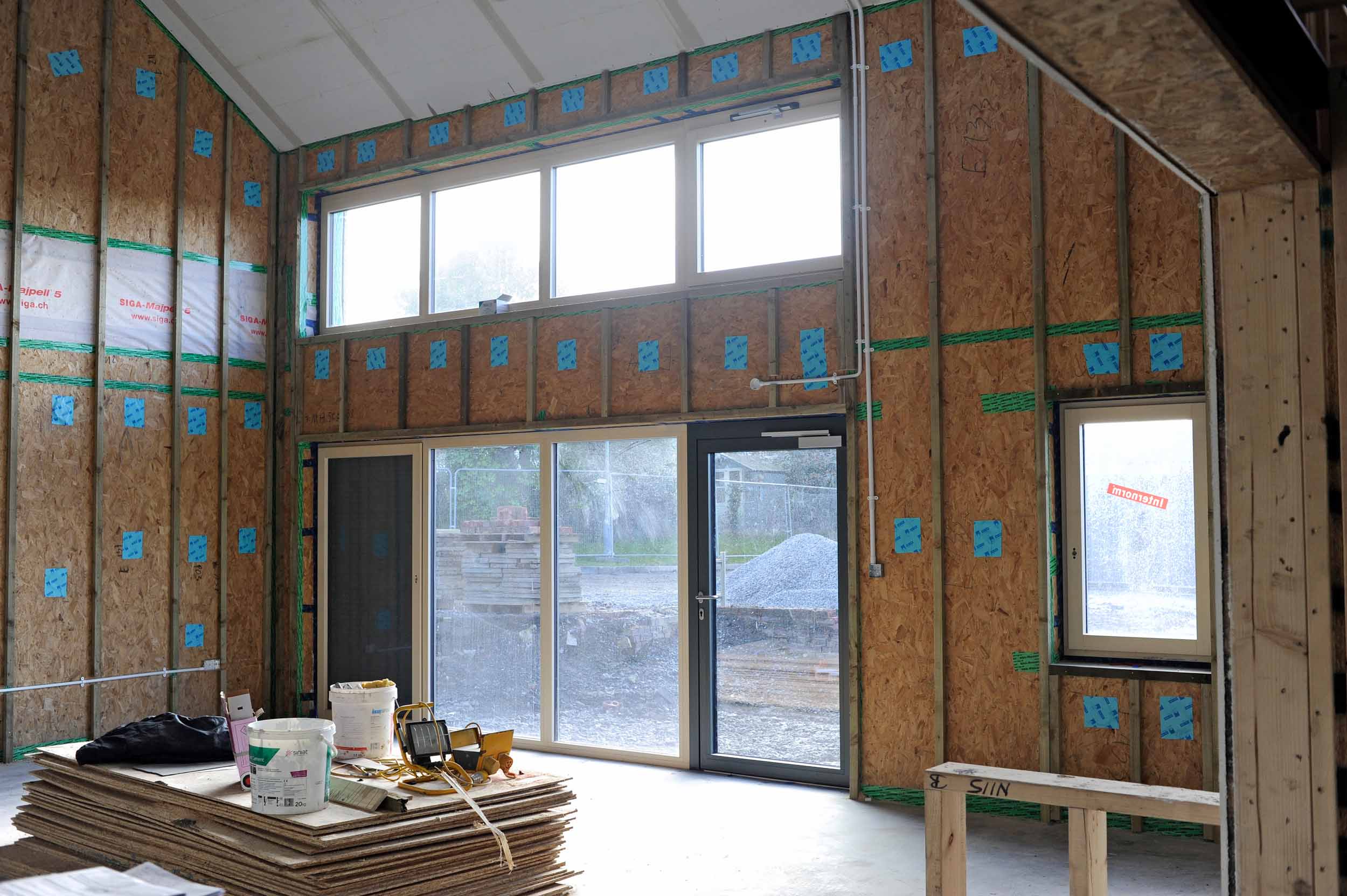 The stapled and sealed 18mm OSB on the inside forms the airtightness layer.