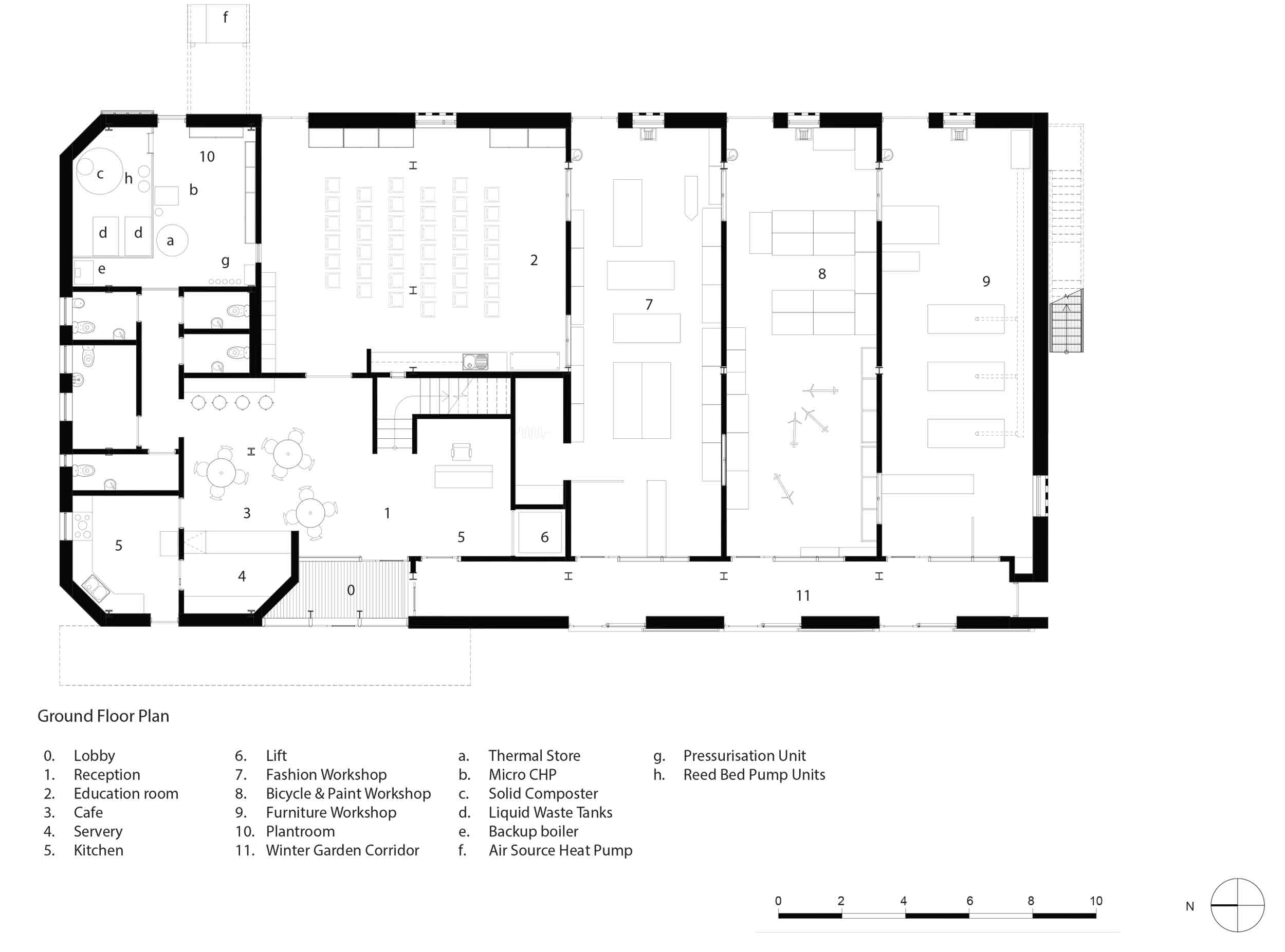 Building services, construction materials and pipework have been left exposed and are labelled so that visitors know exactly what they’re looking at. There are viewing panels into plant room, workshops and out onto the roof.