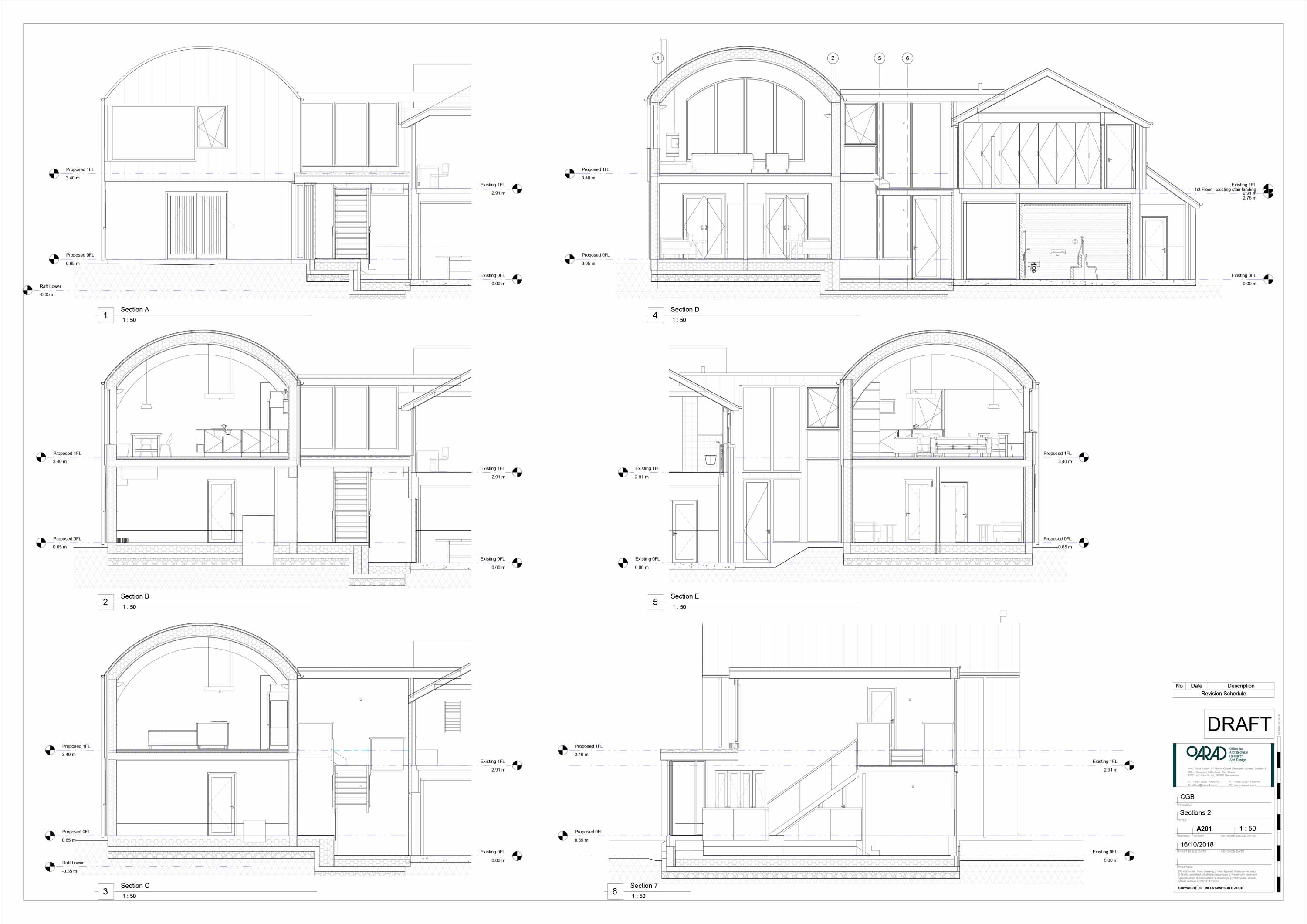 New extension: VMZinc externally, followed inside by 20mm softwood treated boards, ventilated cavity, breather membrane, 11mm OSB, 319mm cellulose insulation between rafters, Intello vapour variable barrier/ airtightness membrane, 50mm mineral wool filled service cavity, plasterboard. U-Value: 0.15 W/m2K