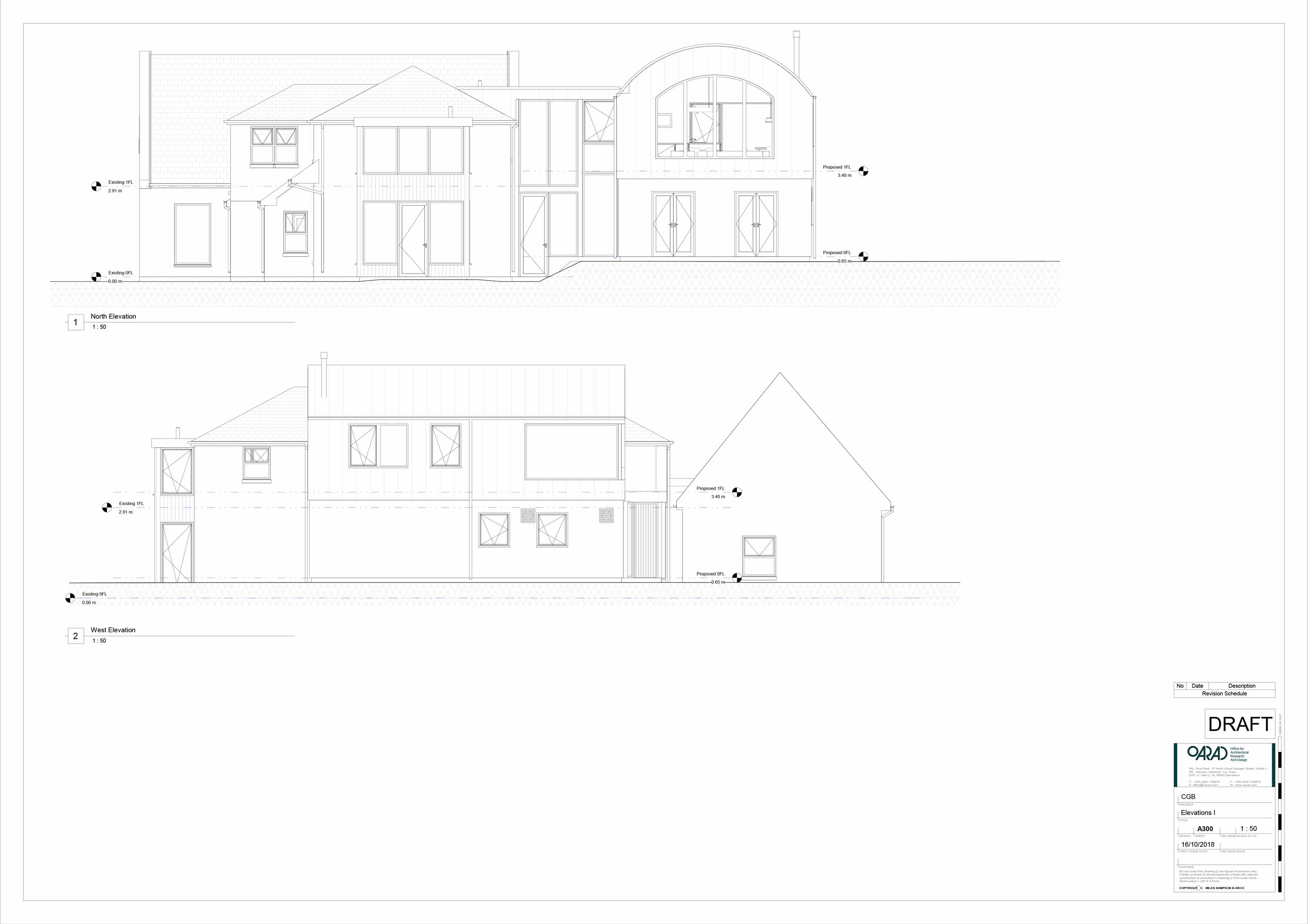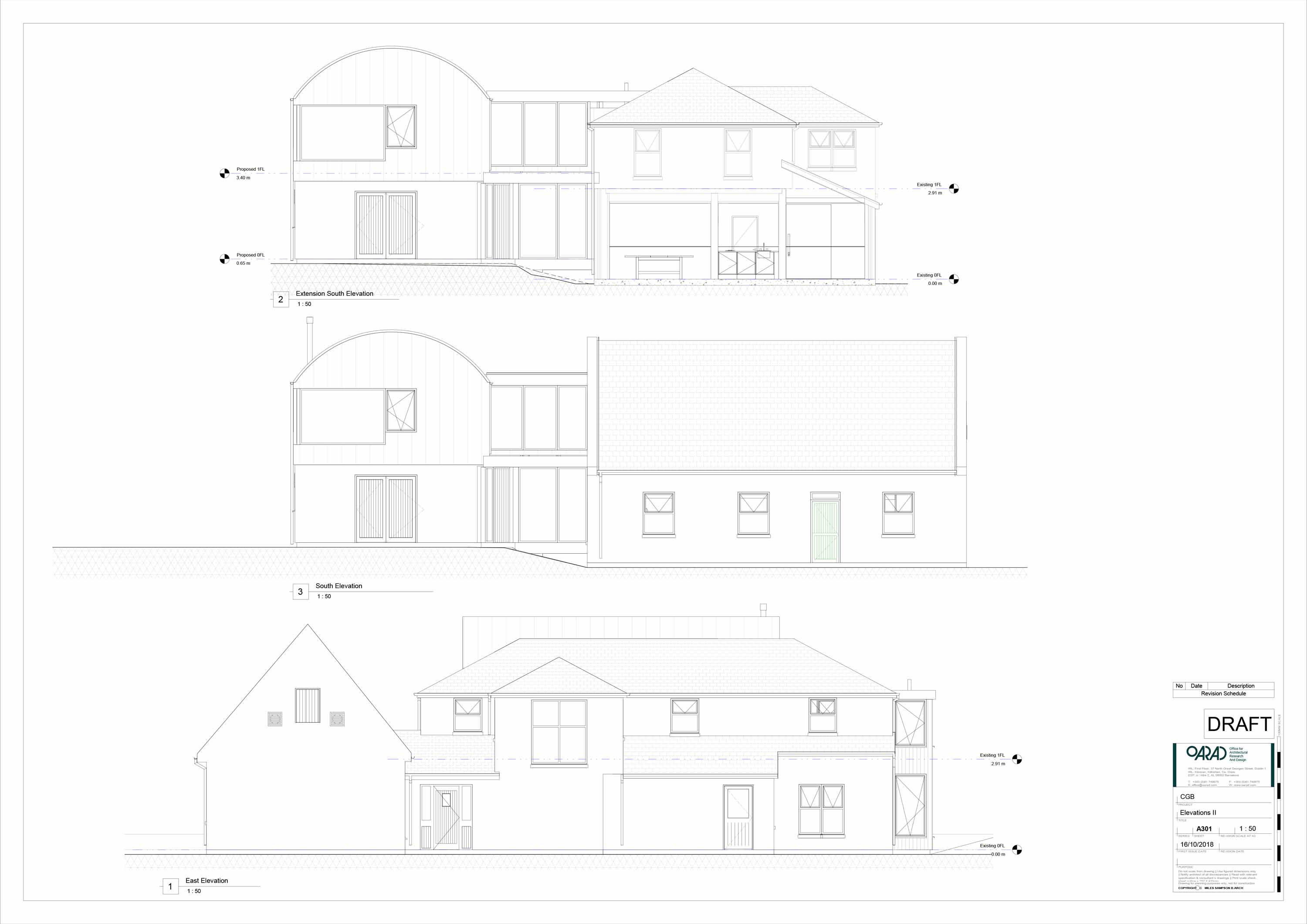New extension: Prefabricated timber frame with zinc or cement board cladding externally followed inside by ventilation cavity, 11mm OSB, 219mm cellulose filled timber studs, Intello vapour variable barrier/airtightness membrane, 50mm mineral wool filled service cavity, plasterboard. U-value: 0.19 W/m2K Cottage renovation: Existing rough stone wall, followed inside by existing foam filled drylining, 50mm sheep wool insulation fill between battens, Intello vapour variable barrier/airtightness membrane, 50mm sheep wool insulation filled service cavity, plasterboard. U-Value: 0.2 W/m2K