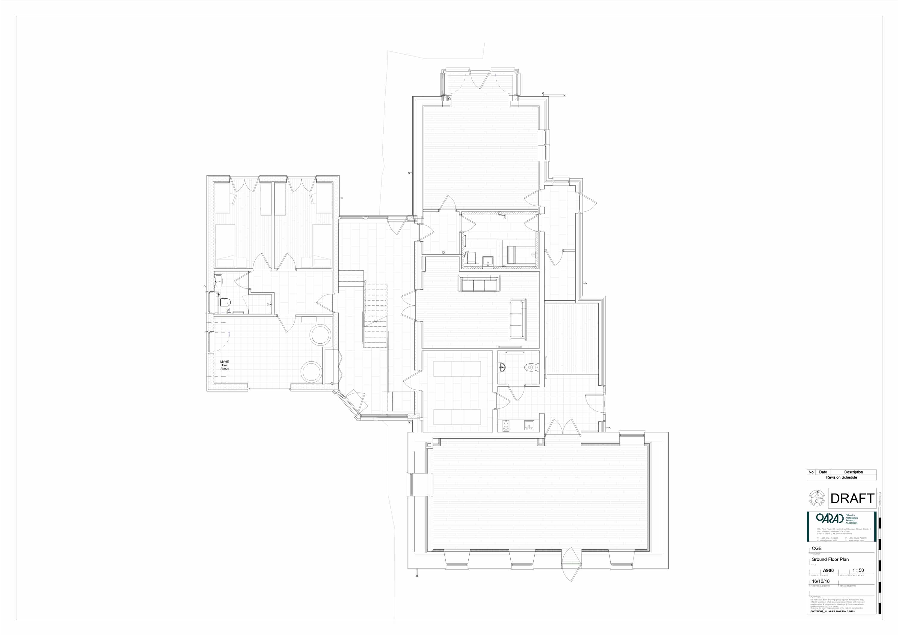 Ground floor (new extension): Raft foundation insulated with 250mm graphite enhanced EPS insulation, 85mm GGBS concrete screed. U-value: 0.10 W/m2K