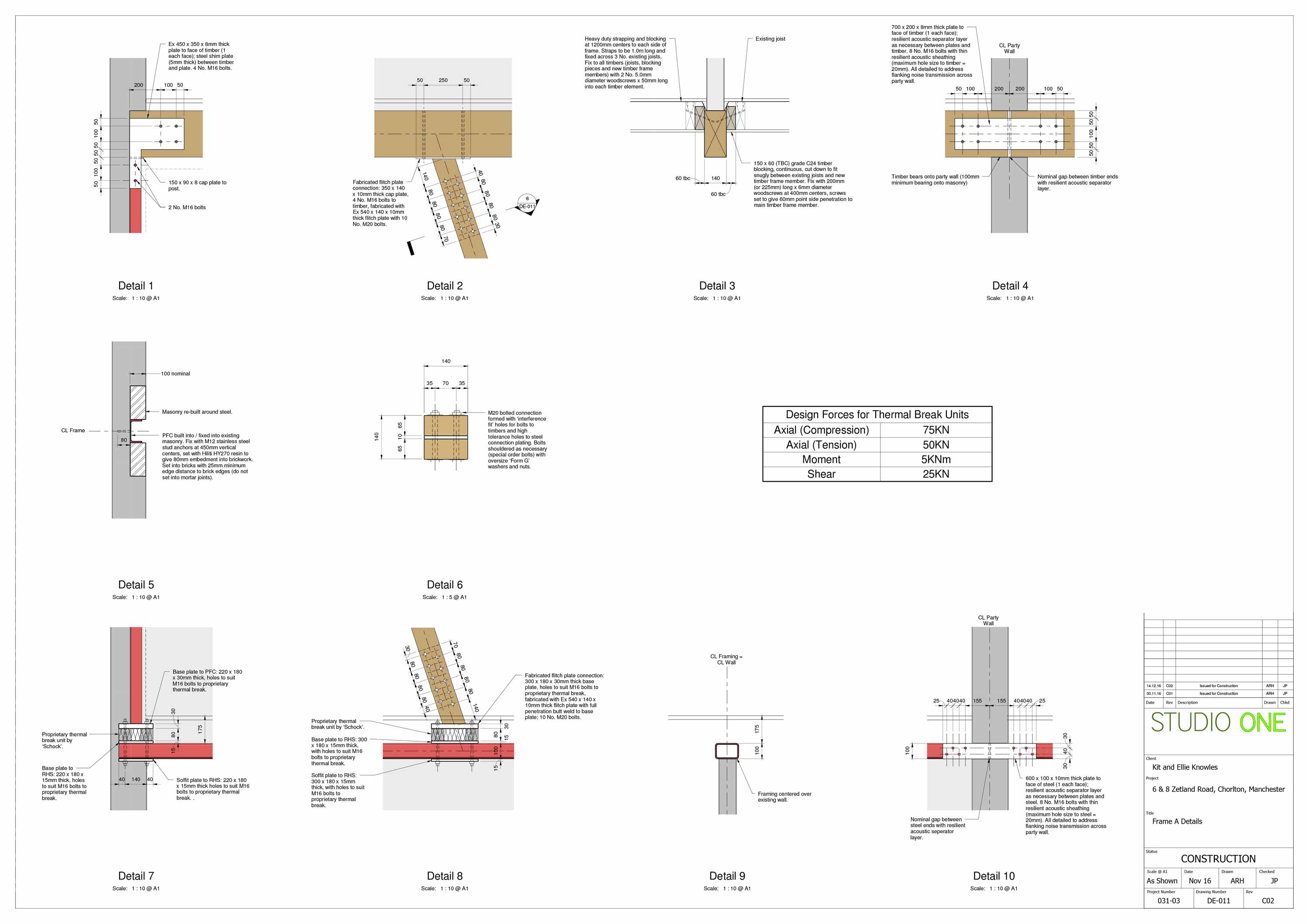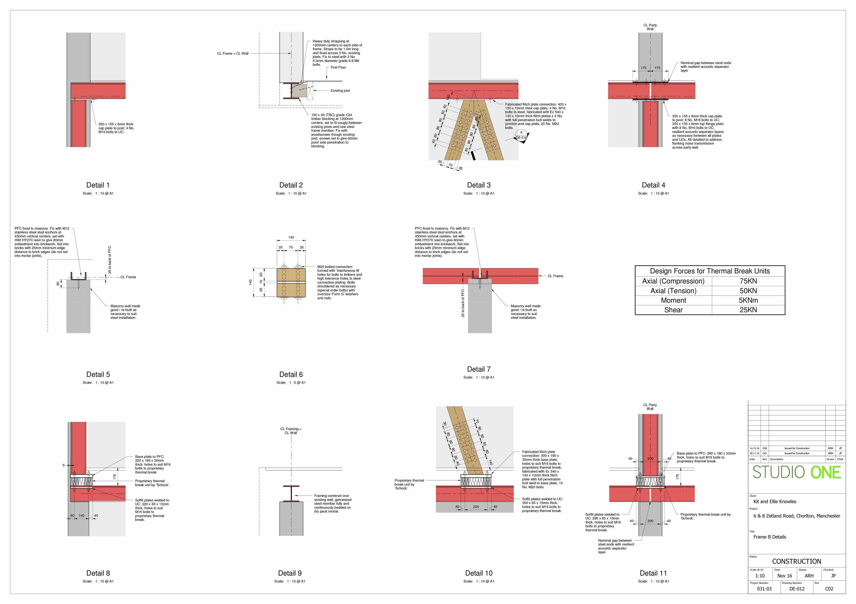 Front walls: Storm dry brick cream on 110mm Victorian facing brick externally, followed inside by 38mm cavity, 13mm Fermacell board, 145mm timber I-joists fully filled with Steico floc blown cellulose, 80mm Steico Protect Dry wood fibre insulation, 10mm Thermalime plaster. U-value: 0.175 W/m2 K