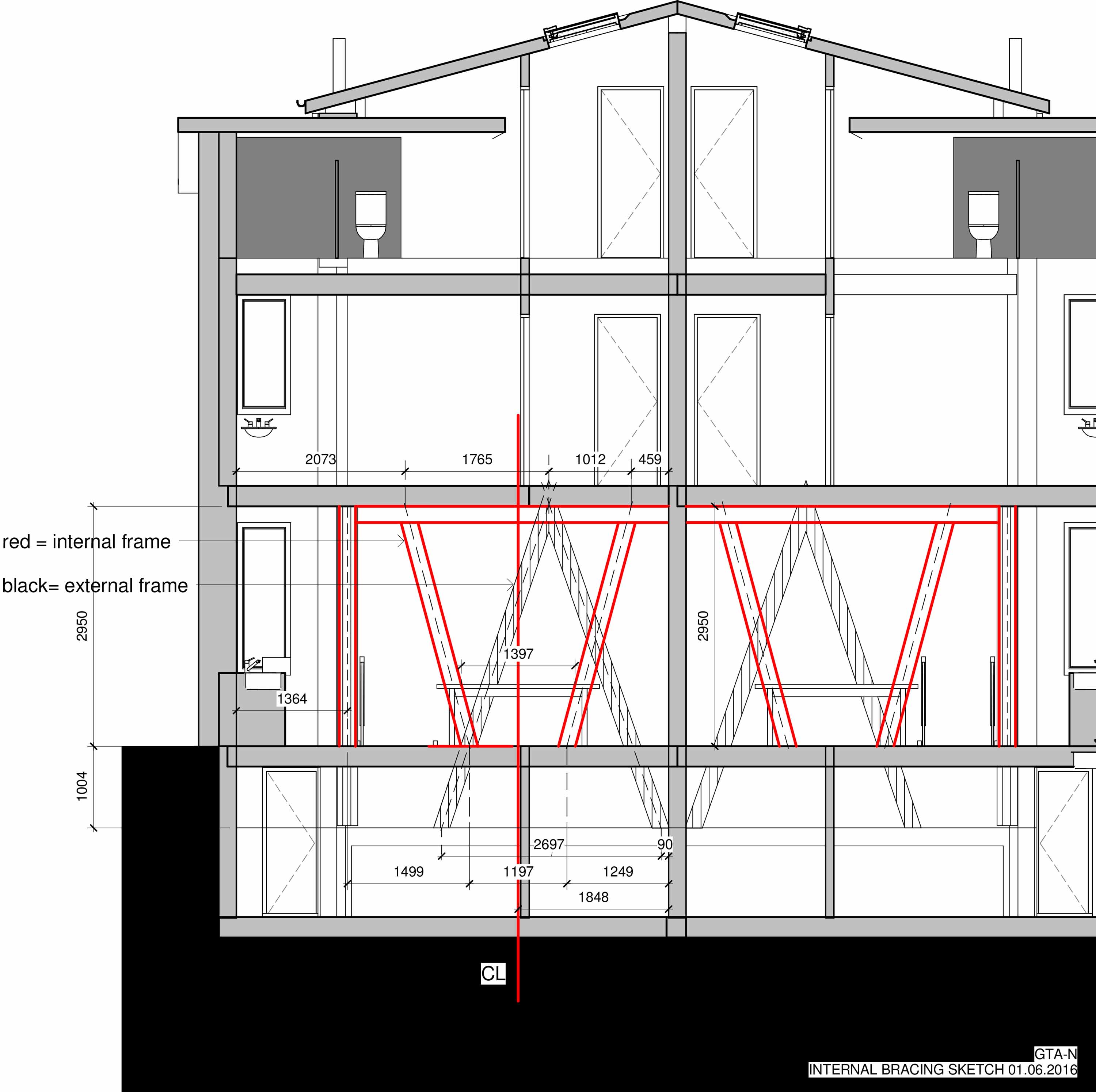 The walls of the houses are solid brick, and in places a second inner leaf of brick was removed. The side walls were externally insulated using Steico’s FSC-certified timber I-joists, which were insulated with cellulose, covered with wood-fibre, and finished in lime.