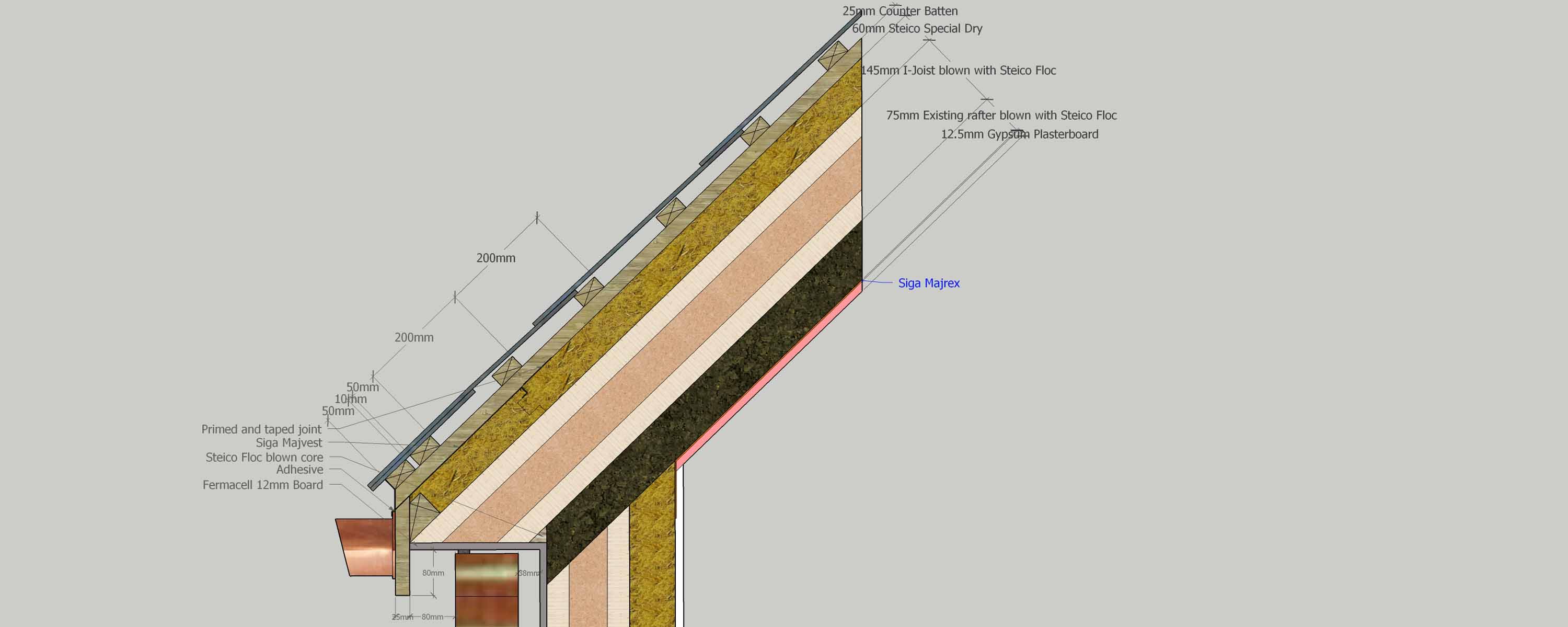 Roof (after): Welsh slate externally on 50x35 battens/counter battens, followed underneath by 1mm breathable roofing membrane, 60mm Steico Special Dry wood fibre board, 145mm to 300mm timber I-joists fully filled with Steico floc blown cellulose, 75mm rafters fully filled with Steico floc blown cellulose, 1mm Pro Clima Intello or Siga membrane, 13mm gypsum plasterboard U-value: 0.108-0.148 W/m2 K