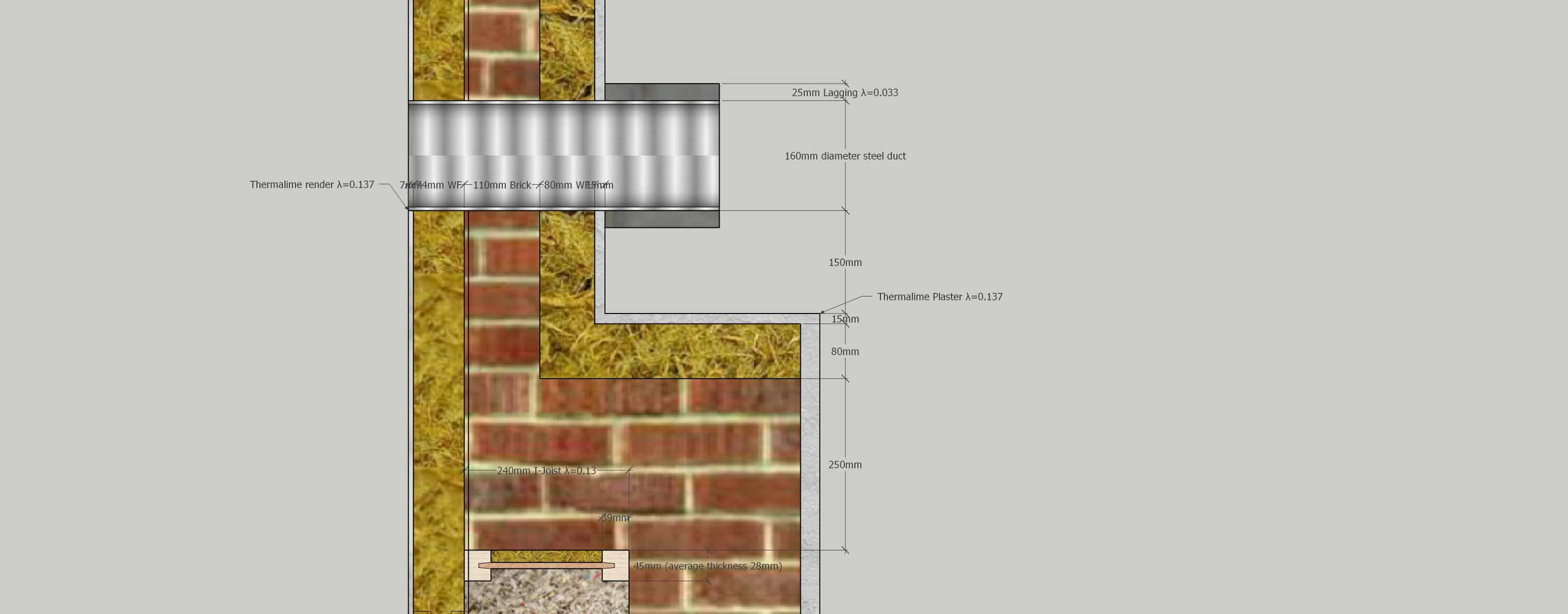 Side walls: 14mm Thermalime render on 80mm Steico Protect Dry externally, followed inside by 240mm Steico floc blown cellulose between Steico I-joists, 250mm double layer of Victorian wire cut bricks with finger cavity, 10mm Thermalime plaster internally. U-value: 0.116 W/m2 K