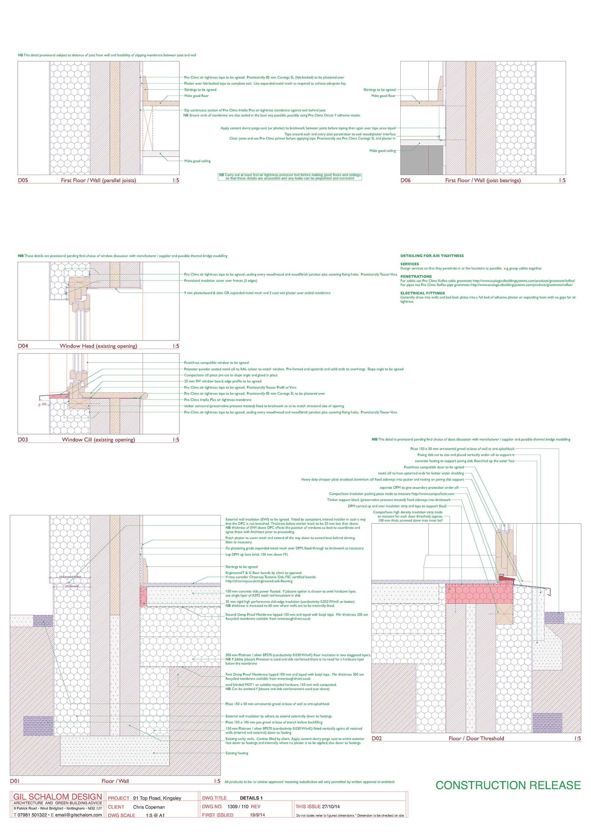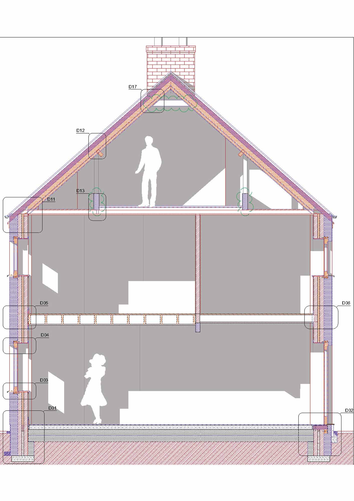 Thermal bridging: Inner leaf of brickwork had course of bricks removed and replaced with Foamglas Perinsul strips at level of floor insulation to connect with cavity insulation. This was repeated under retained internal brick walls. Thermal bridges calculated by Green Building Store.