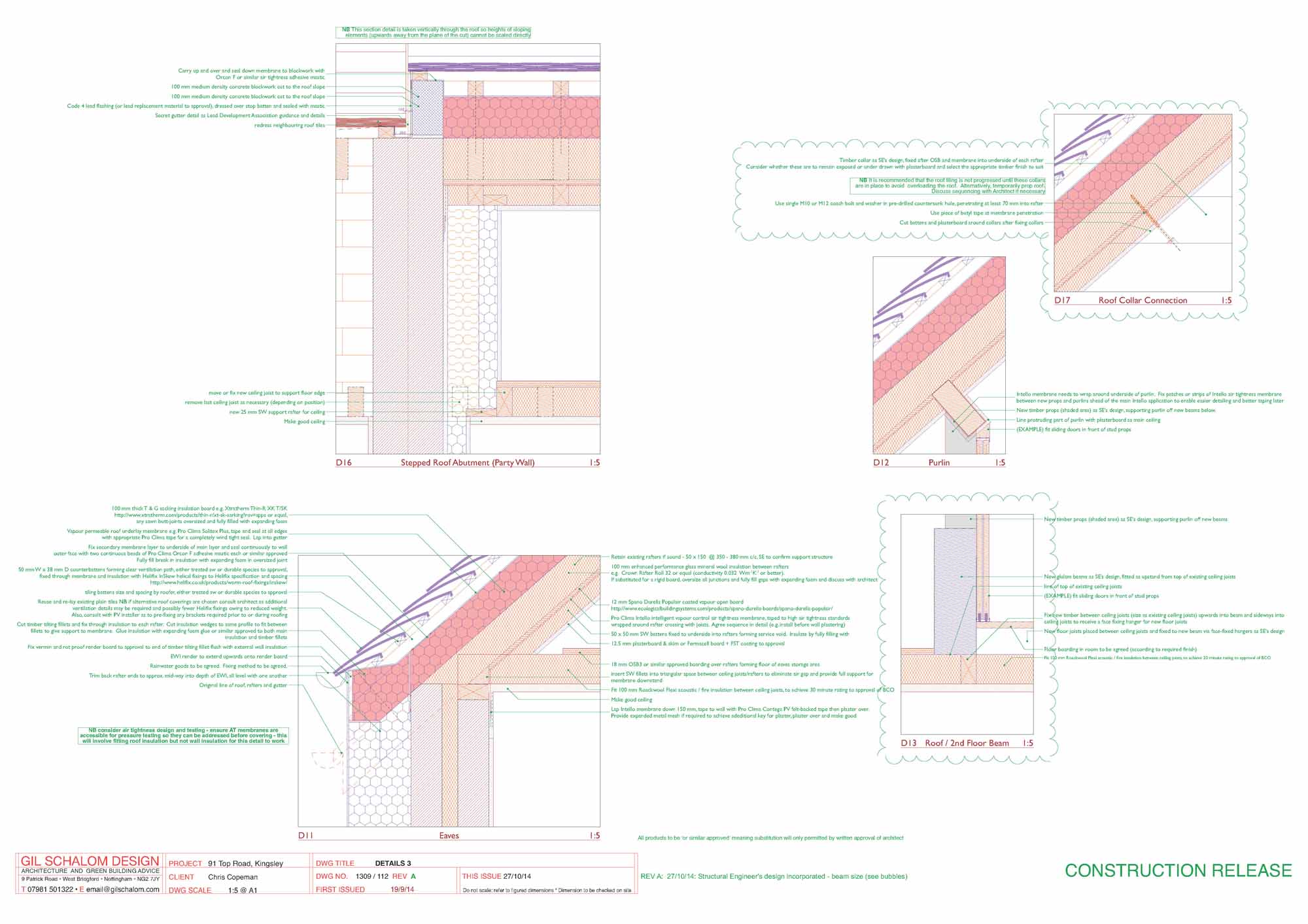 Roof build-up includes plain tiles followed inside by battens with pro clima Solitex taped wind-tightness membrane over counter battens, over Xtratherm Thin-R 100mm boards