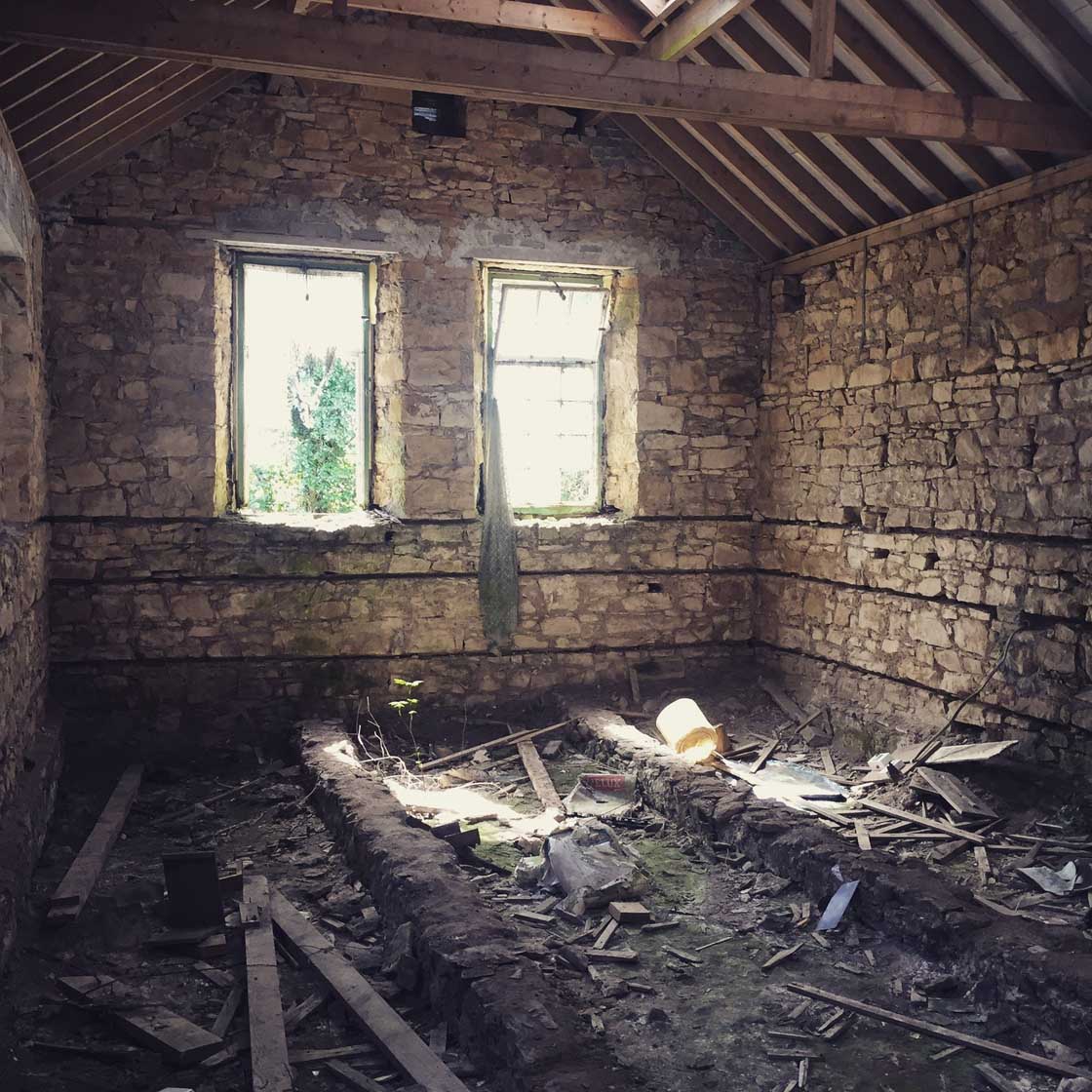 The most surprising thing about the building was that it was bone dry inside. “The first time I walked in with a friend who lived up there, we couldn’t believe how dry it was. You’d expect everything to be covered in mould. But the roof was sound, and all the windows were broken, so there was plenty of air circulating through it.” In addition, well-draining soil and the elevated location meant that moisture tended to fall away from the site.