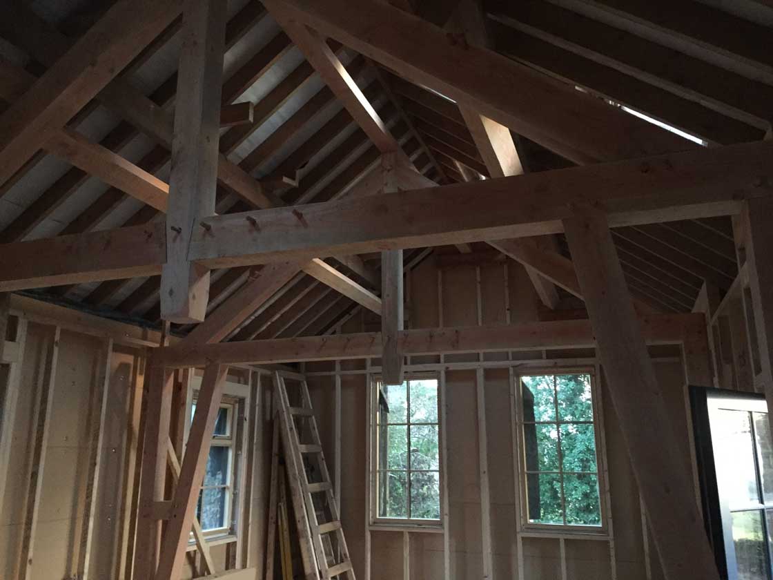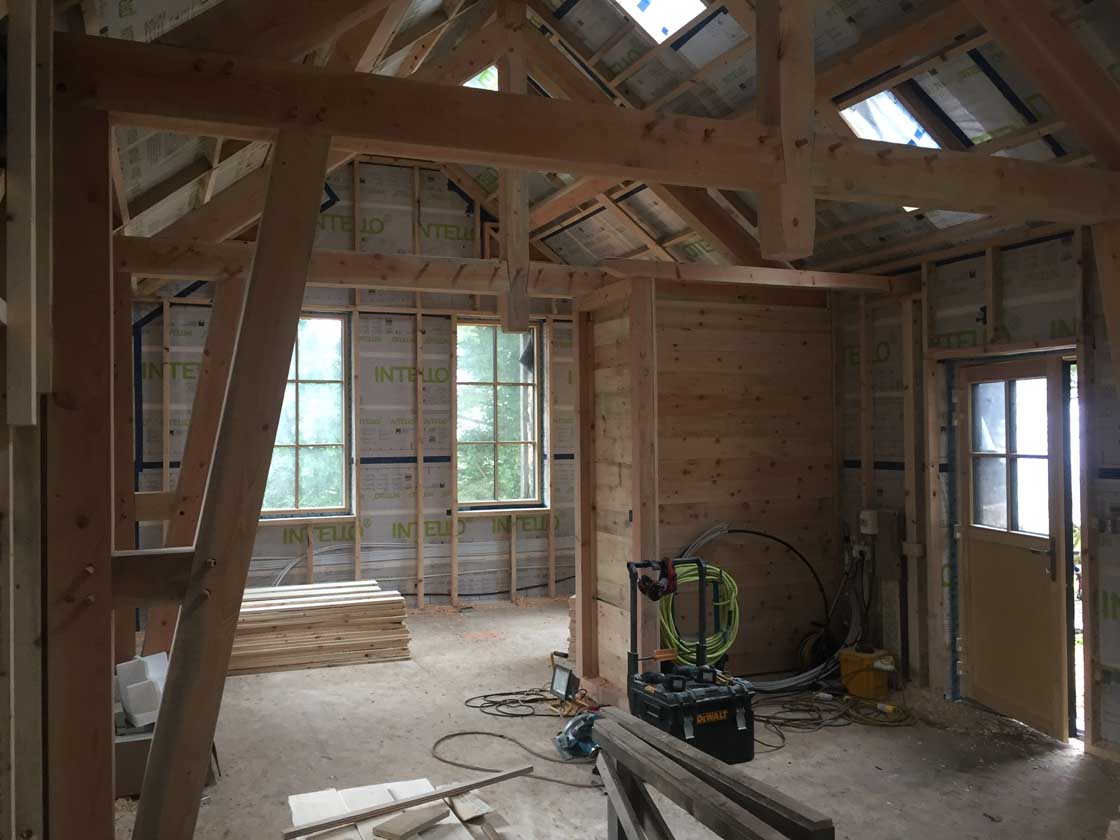 Douglas fir for the interior frame was sourced from a local sawmill, while studwork on the inside of the walls and roof was insulated with cellulose and then covered with an Intello vapour control and airtightness membrane