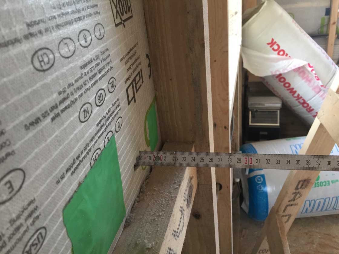 Measuring tape showing the depth of the cellulose-insulated stud, with Intello membrane applied to the room-face.