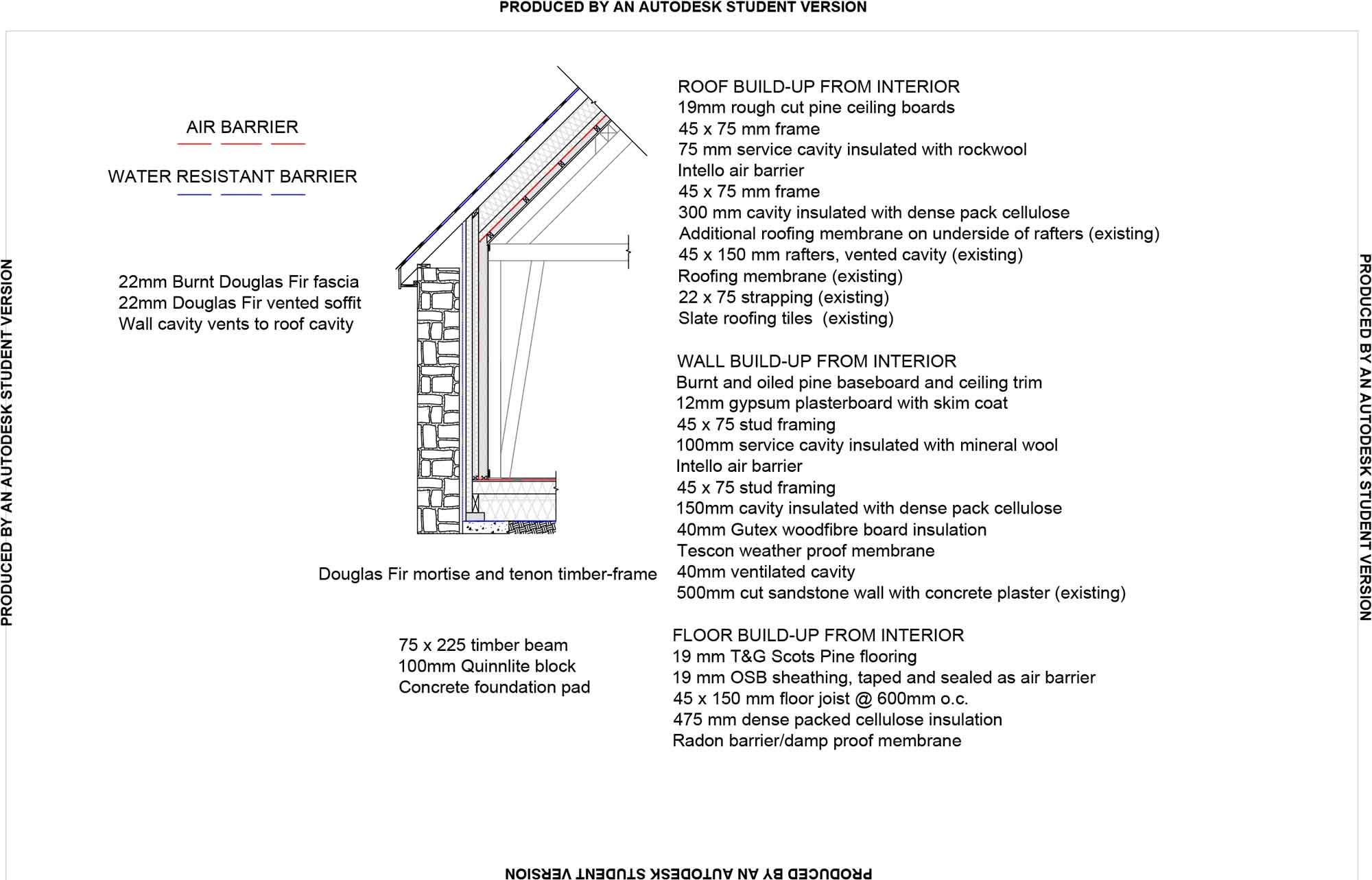 After: Slates on wooden strapping over weatherproof membrane (all retained). Existing rafters as air space. Breathable membrane, 300 mm cellulose insulation in stud framed cavity, Intello air barrier, 100 mm Rockwool insulation in stud framed cavity, 19 mm wooden ceiling. U-value: 0.10 W/m2K
