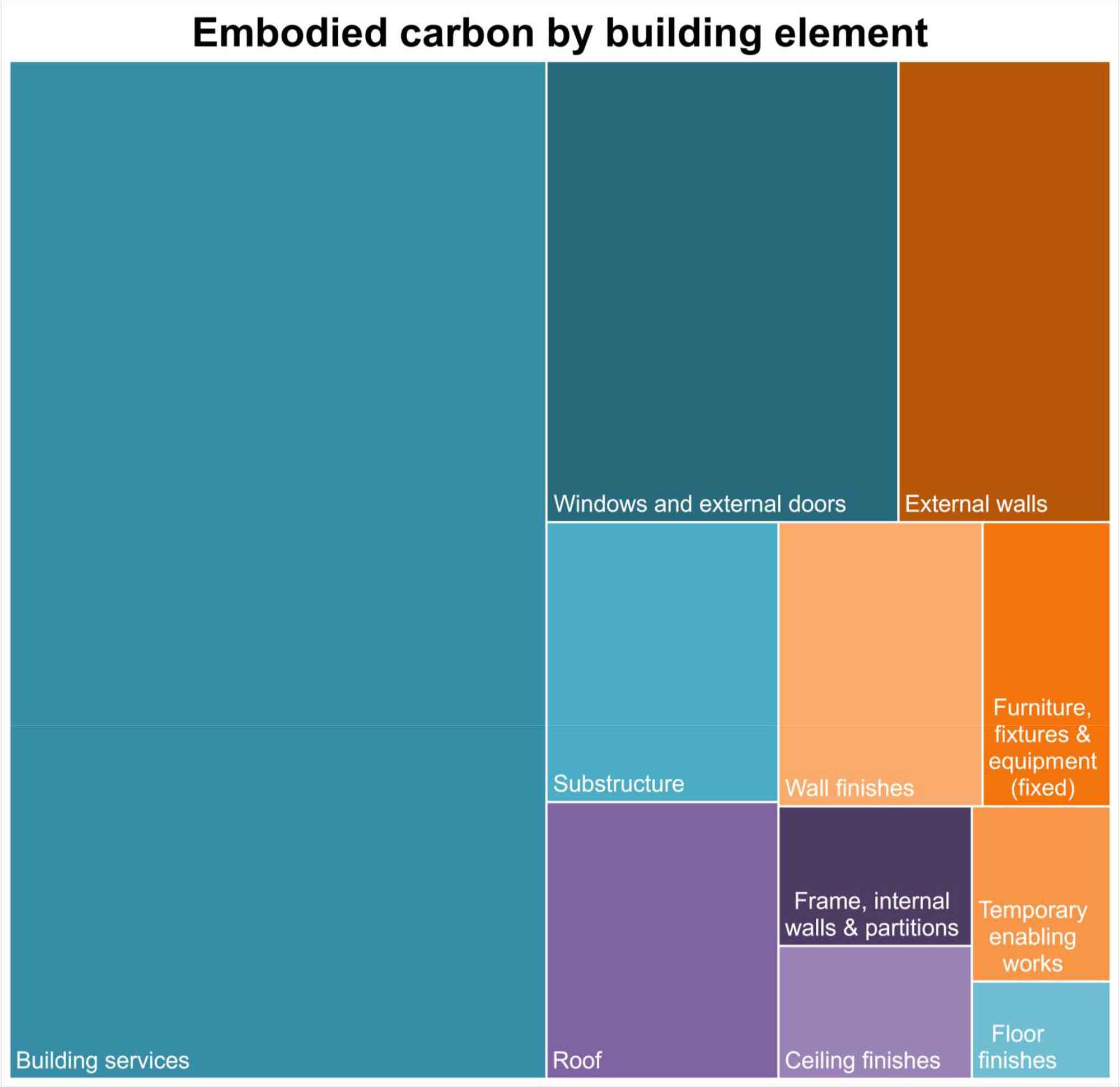 As if to emphasize that point, by far the single greatest contribution to the embodied carbon score of the building is the building services, which represent 48.8 per cent of the total emissions. The vast bulk of this total comes from the heat pump, which is taken to represent over 8.7 tonnes, roughly a third of the total. (It’s important however to emphasize that even when heat pumps come with a significant embodied carbon impact, this tends to be paid back many times over in terms of emissions reductions from operational energy use.)