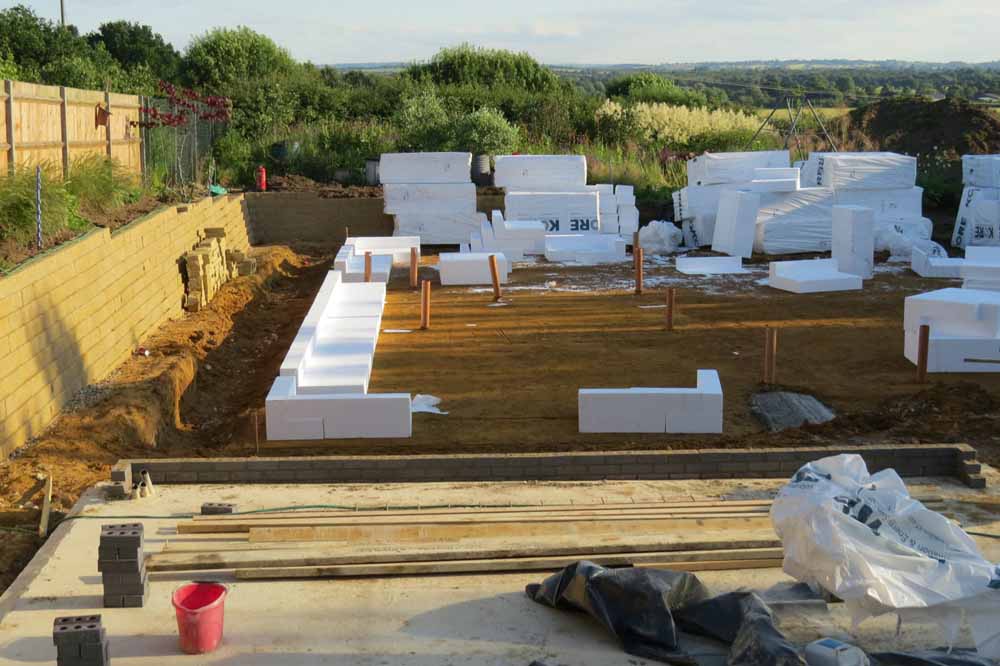 Ground floor: Hardcore and sand blinding, followed above by DPM, 300 mm EPS100 (λ=0.036), separating layer, 100 mm reinforced concrete slab with underfloor heating pipes (thicken to 200 mm x 600 mm wide at perimeter, and load bearing walls). Power-floated finish. U-value: 0.117 W/m2K