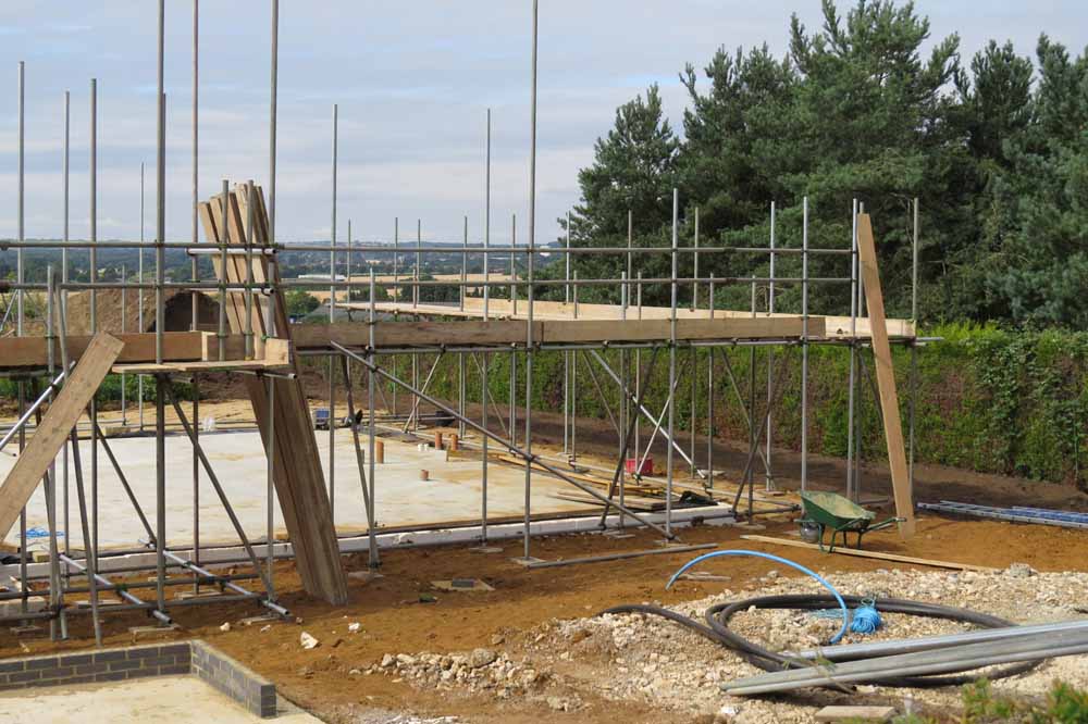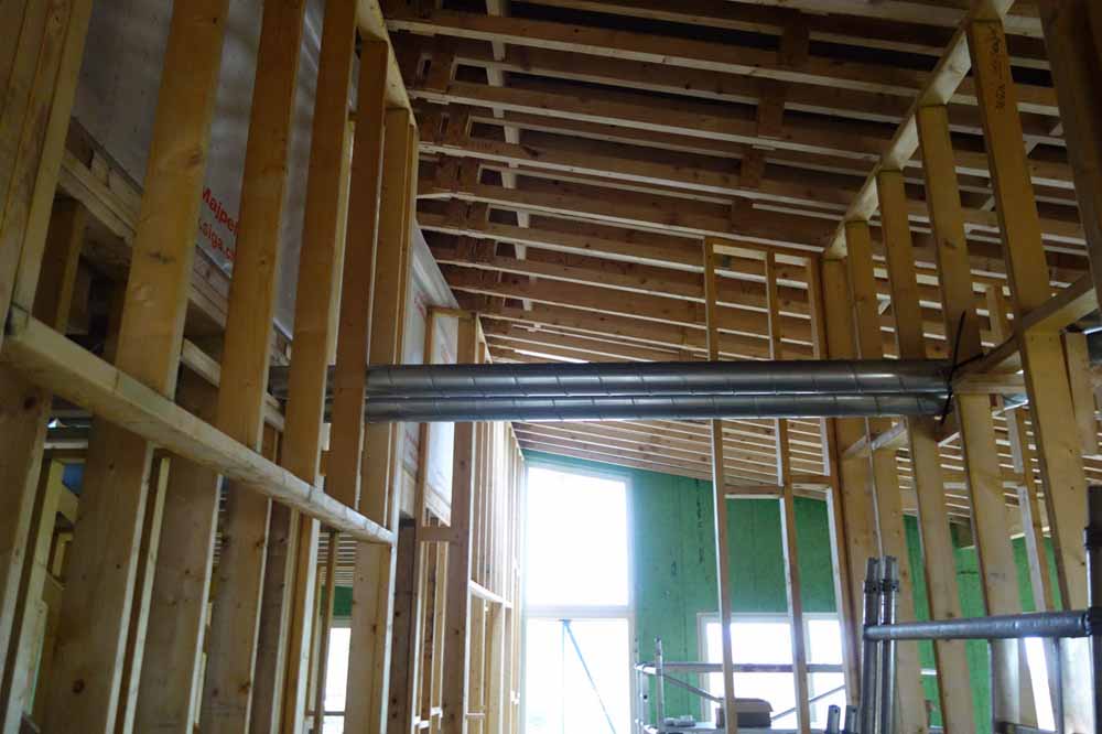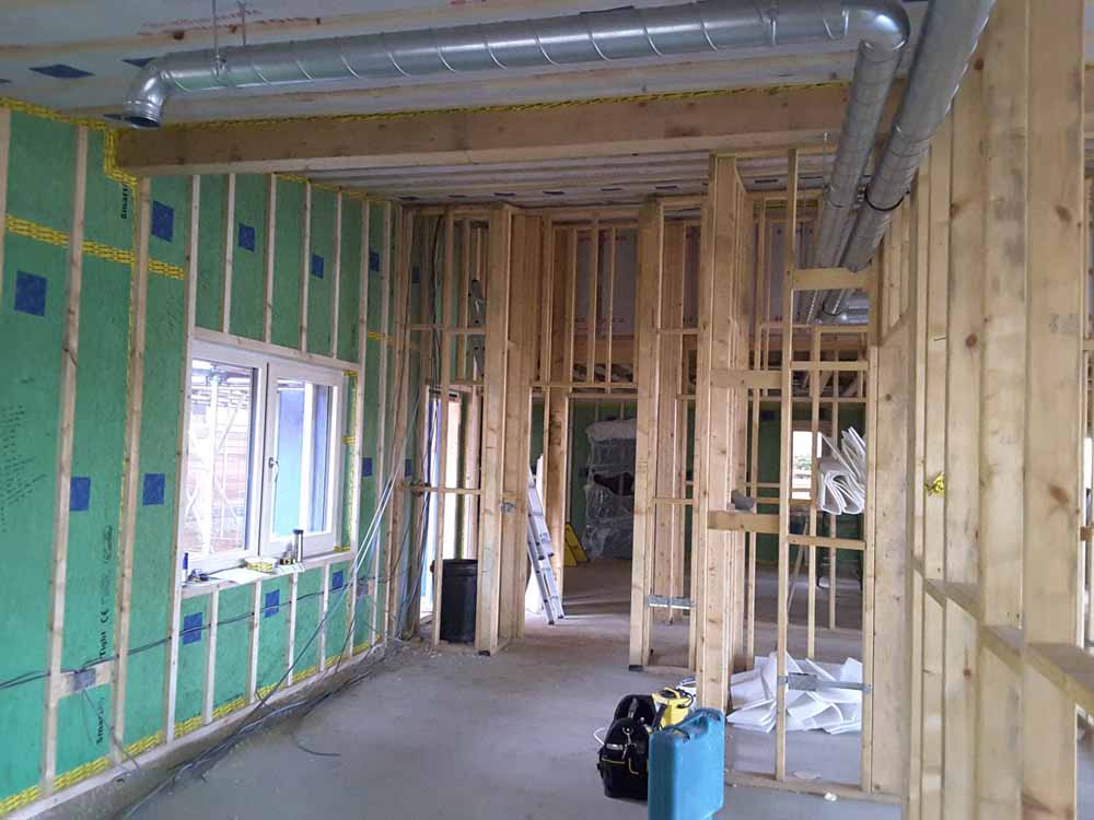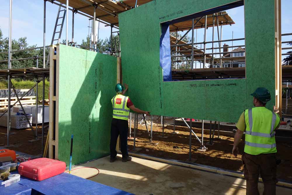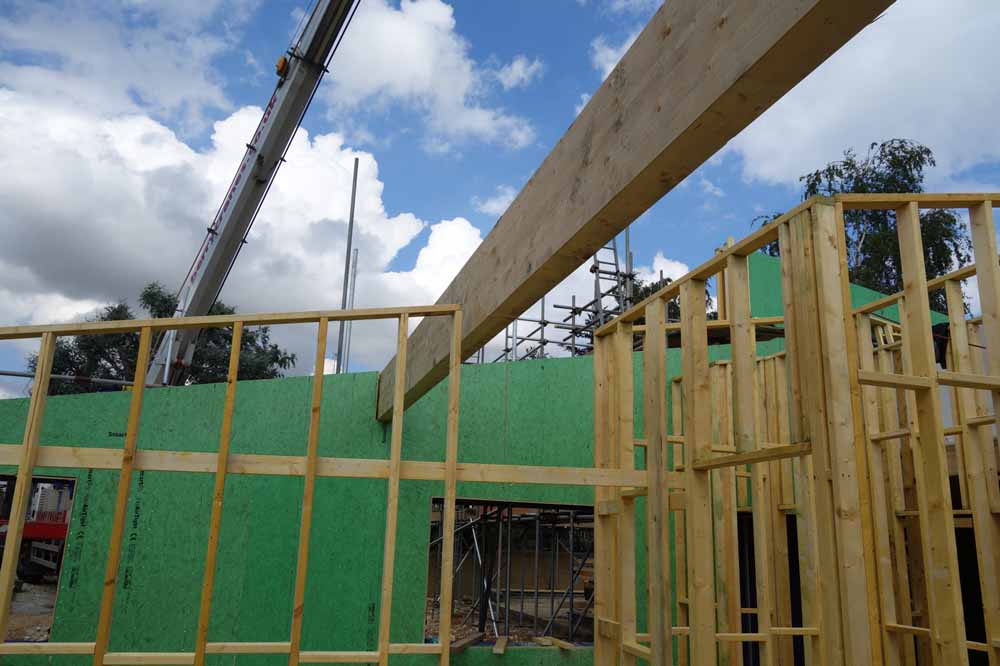 Erection of the MBC timber frame system underway, which is insulated with Warmcel, and the SmartPly ProPassiv panels fitted to the inside delivering outstanding levels of airtightness