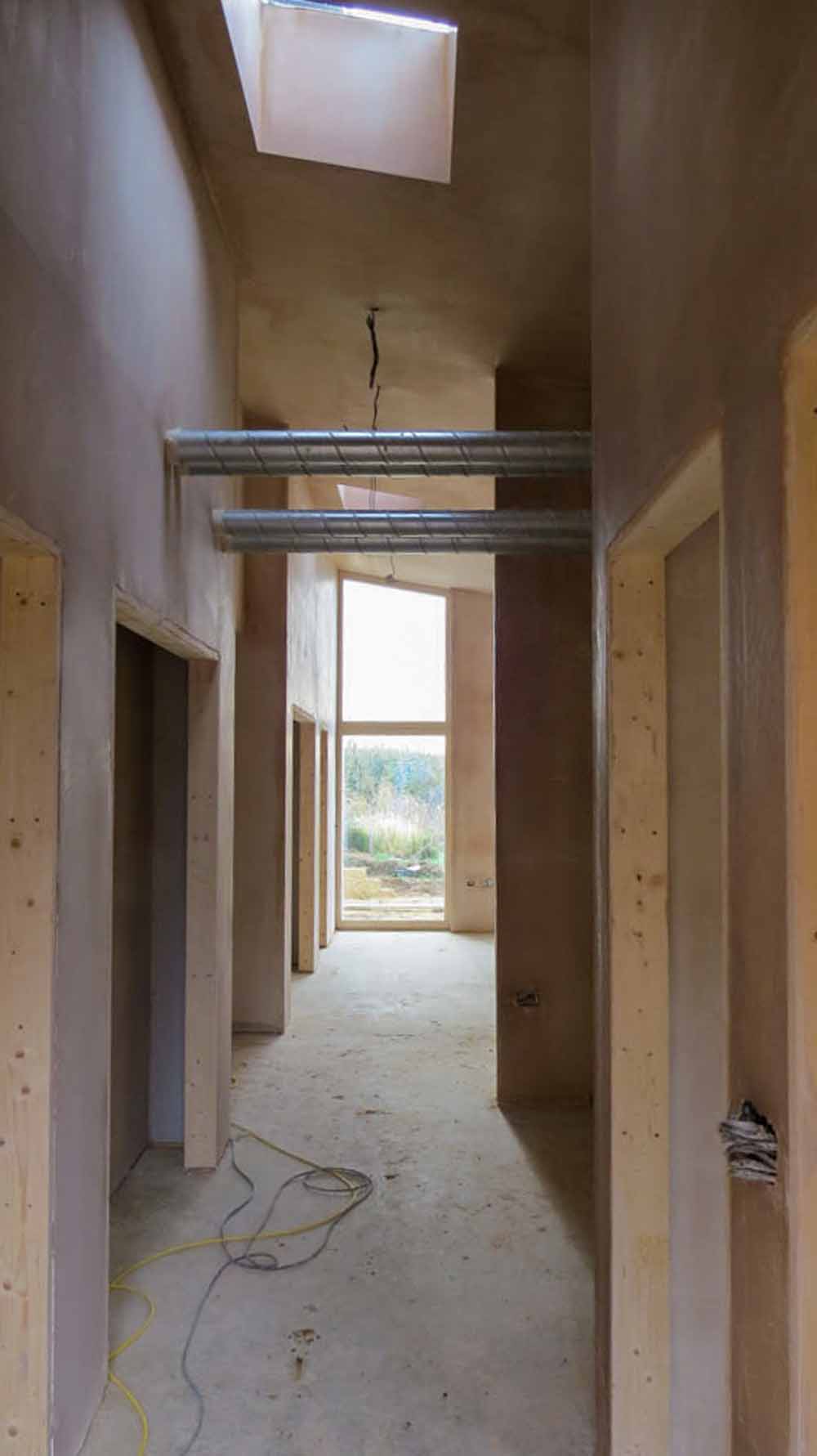 When the district network operator limited the licence for electricity to 24 kW peak, other options were considered in order to reach the passive house premium standard. The couple could have bought shares in a renewable energy scheme, for example. They rejected this solution in the end, but may explore it again in the future. Direct electric heating was also assessed, but using an air source heat pump provided much greater efficiency and could also heat the domestic hot water supply. The air source heat pump and hot water cylinder supply the underfloor heating downstairs, as well as towel rails in the bathroom.