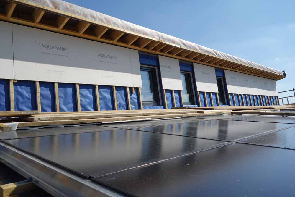 Roof: 80 mm PV curtain walling system externally, with aluminium rails supporting PV panels, and glass to perimeter, followed underneath by 35 x 50 battens and counter battens, Amacol Areo Plus breather membrane, 400 mm MBC Larsen Truss roof panel, with plywood gussets and filled with Warmcel insulation, Siga airtightness membrane, 38 mm service void formed with battens, 12.5 mm plasterboard plus skim. U-value: 0.11 W/m2K