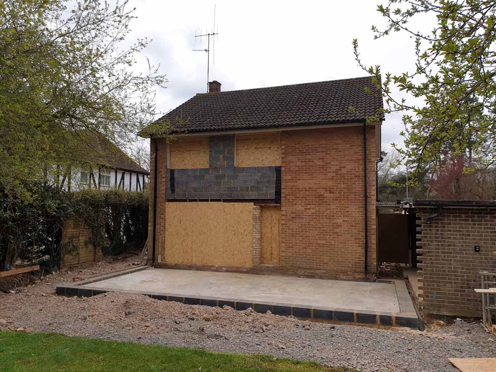 Original rear elevation with curtain wall panels removed and extension slab laid
