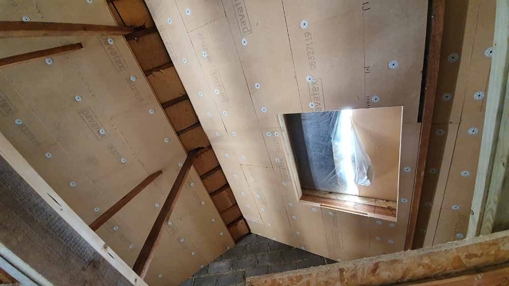 Existing rafters underlined with rigid woodfibre board and opening trimmed out for rooflight over stairs