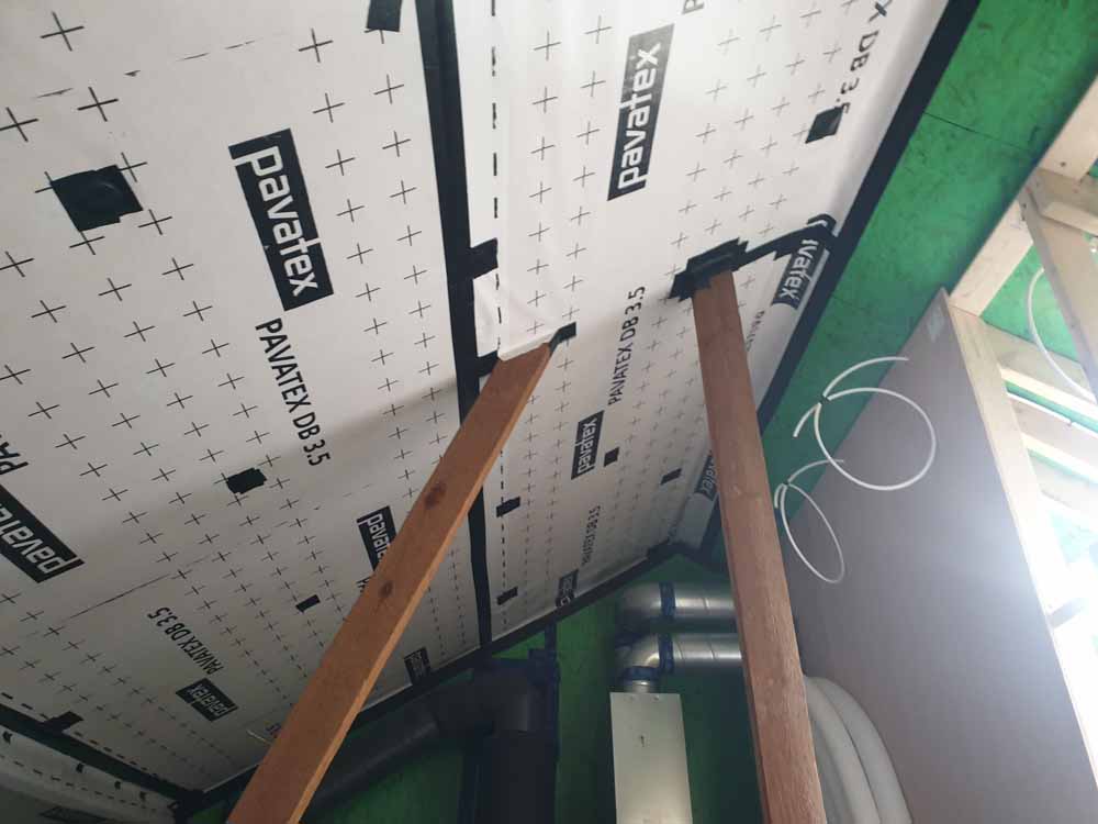 Airtight membrane taped around original roof trusses in loft space housing MVHR