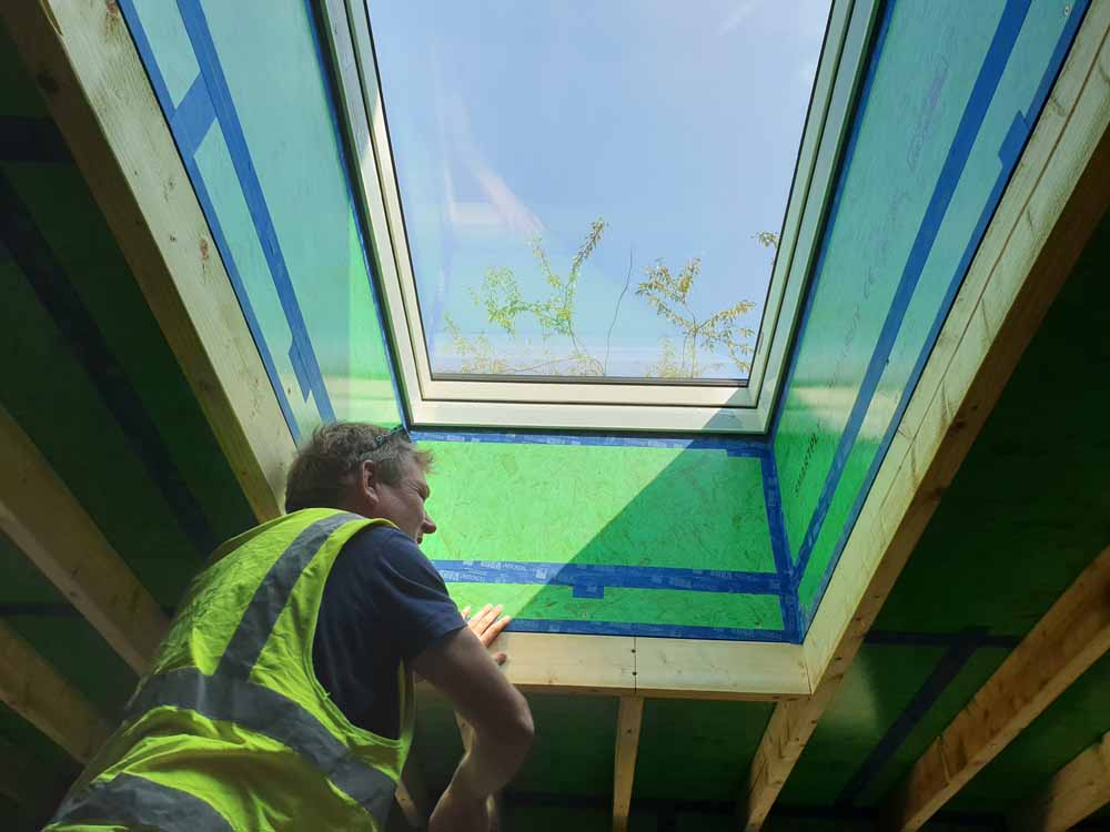 Airtight taping and service void around flat roof light in rear extension