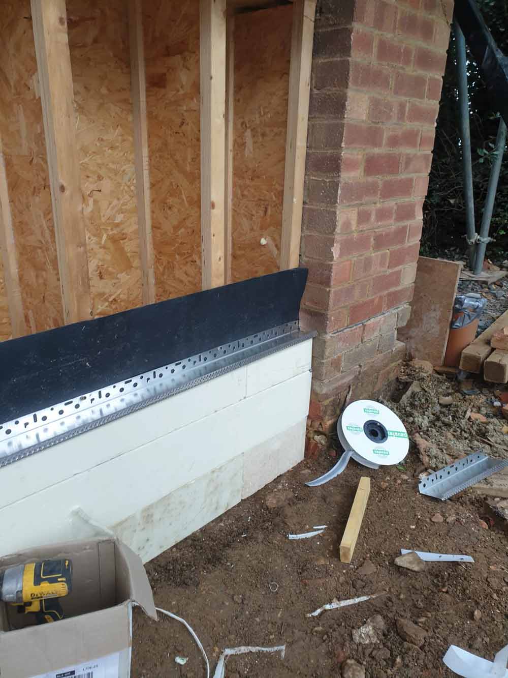 PIR plinth insulation and stop bead up to DPM level ready for external woodfibre insulation to be installed above