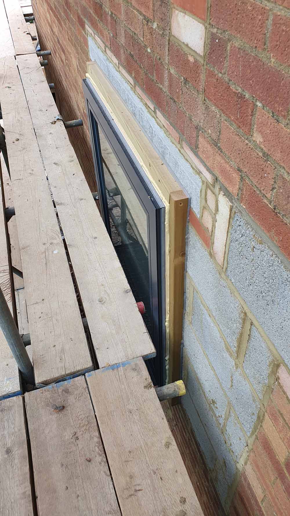 New window installed in existing cavity wall, protruding from brickwork to link into external insulation layer