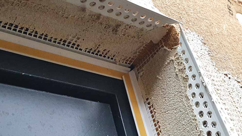 Render beads and base coat applied to woodfibre insulation around window opening