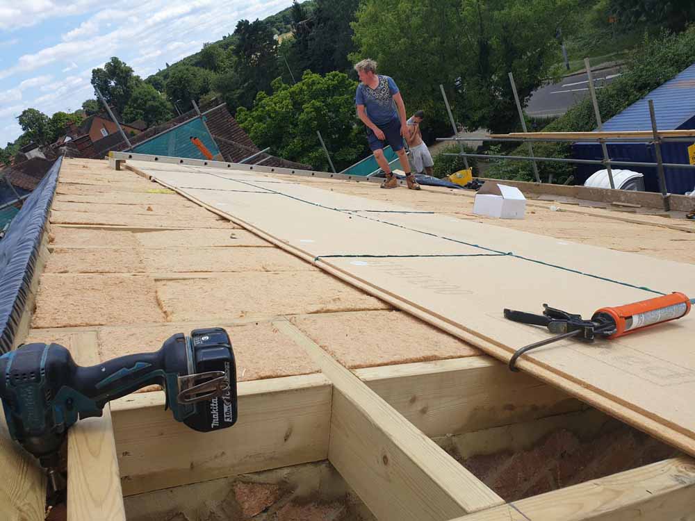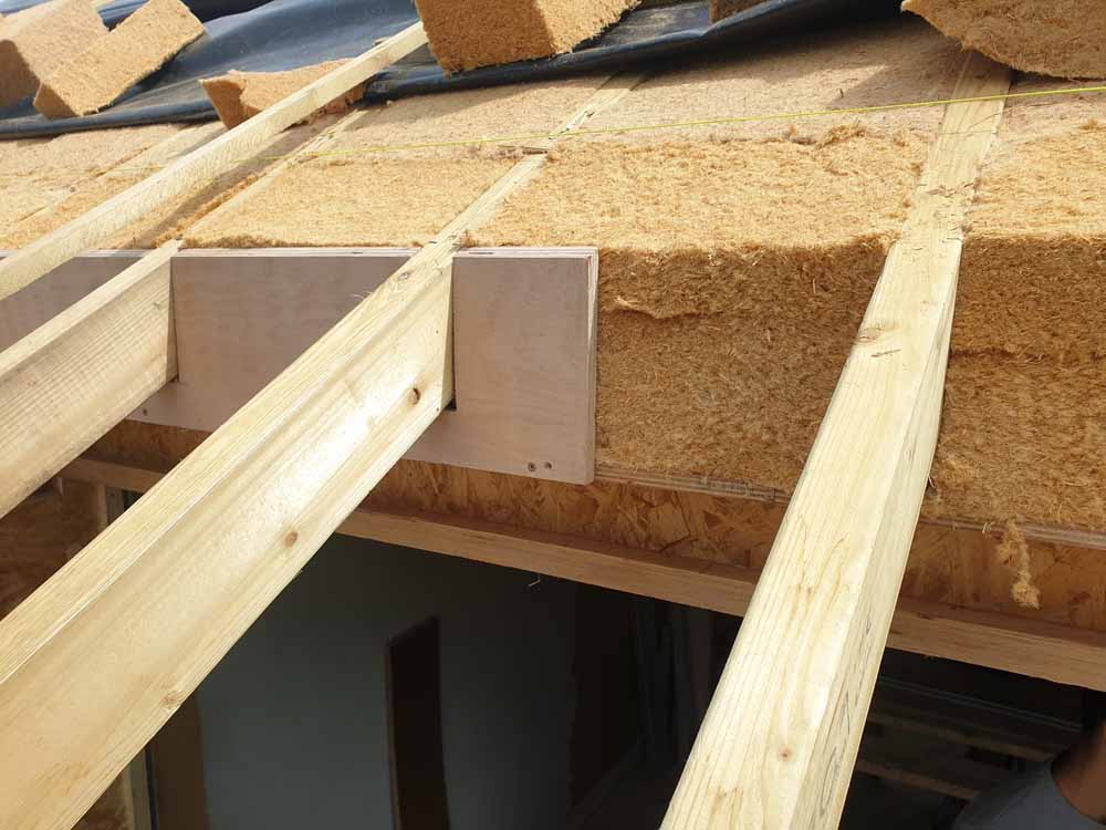 Woodfibre sheathing board installed over the insulated doubled-up rafters