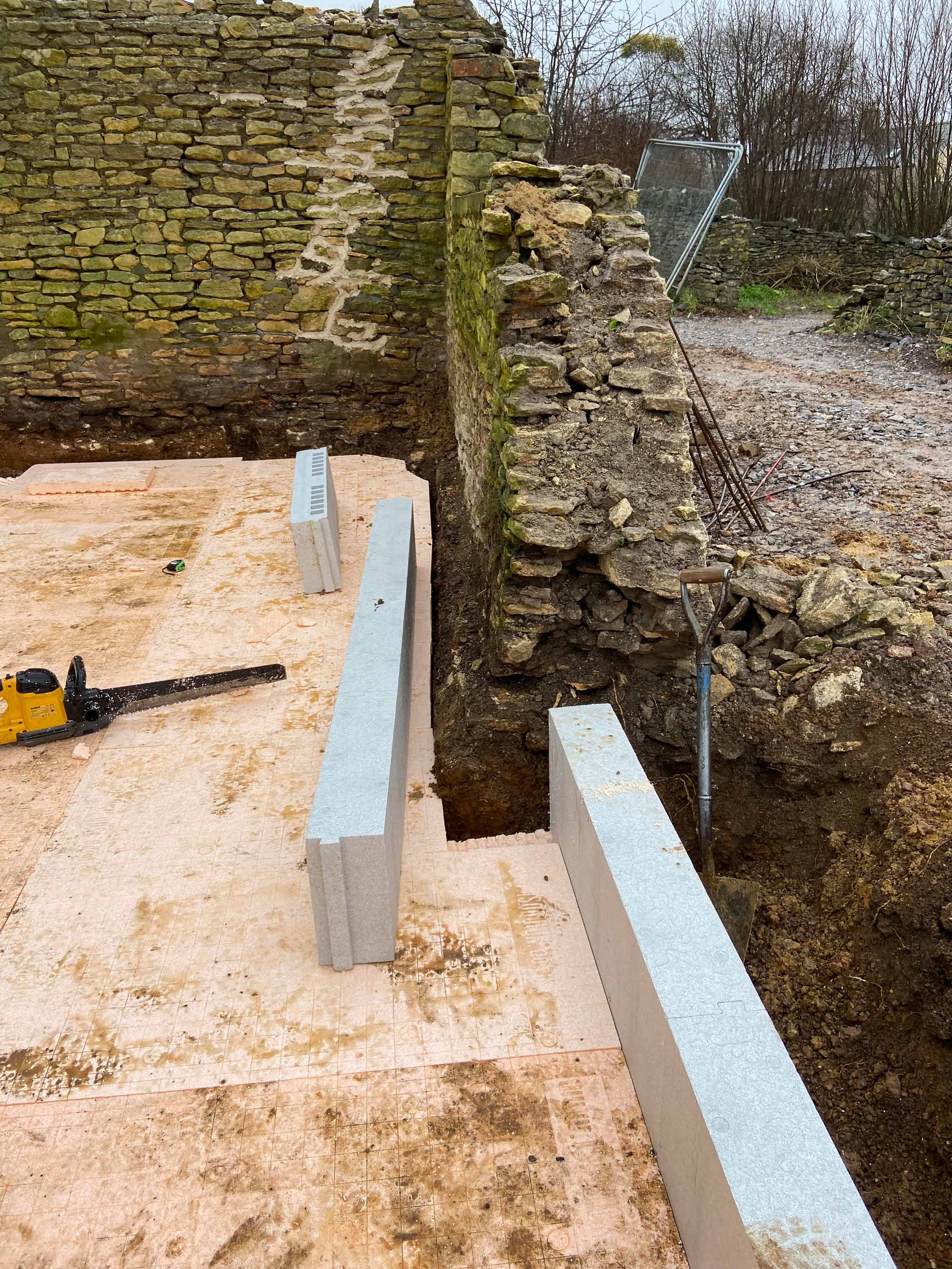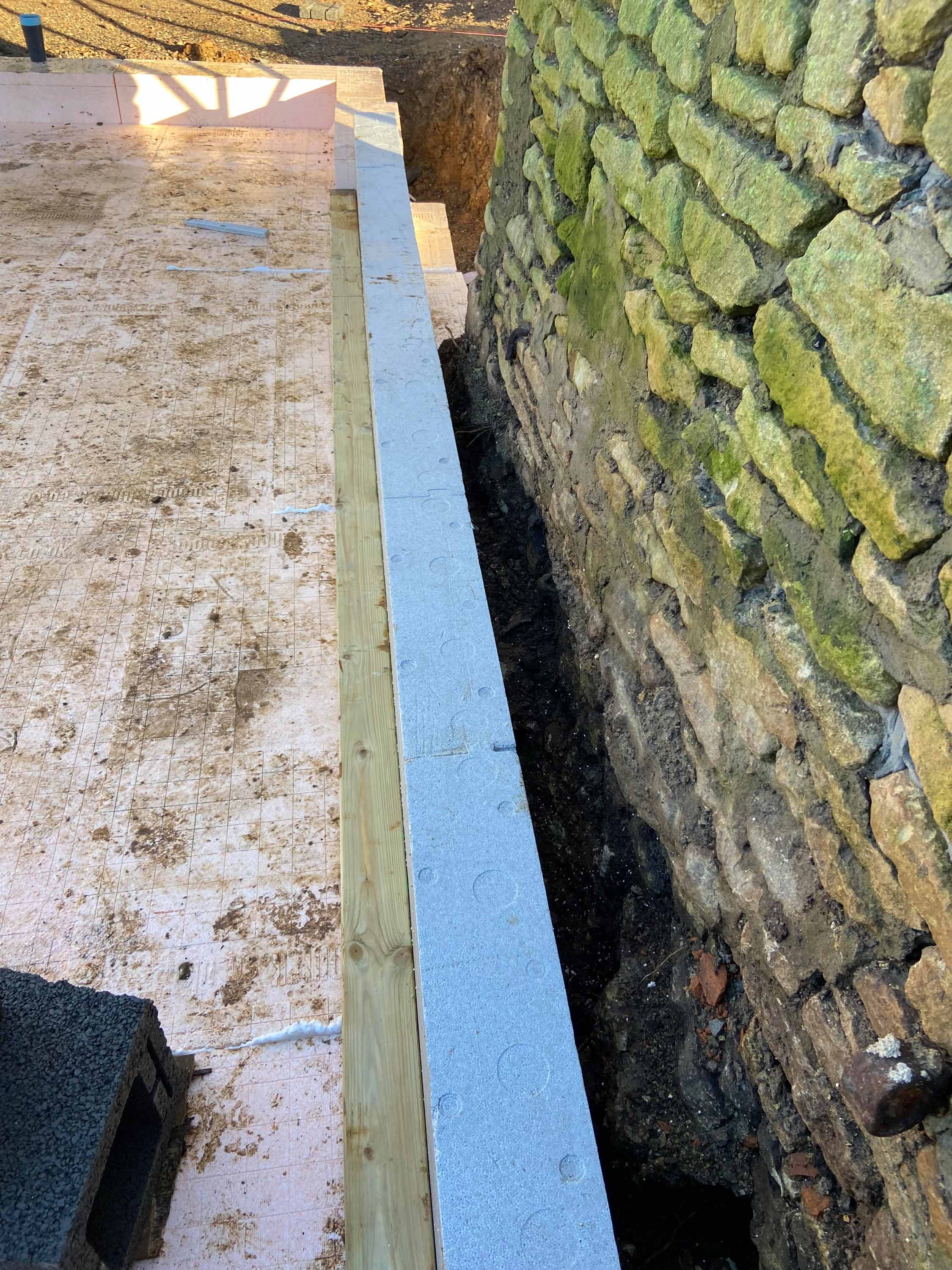 Ground floor: Before: Earth floor. After: 150 mm hardcore, 50 mm blinding, 250 mm Isoquick Peripor, RIW Red DPM, 250 mm RC Slab and 250 mm Isoquick Peripor. U-value: 0.127 W/(m²K) Stone walls: