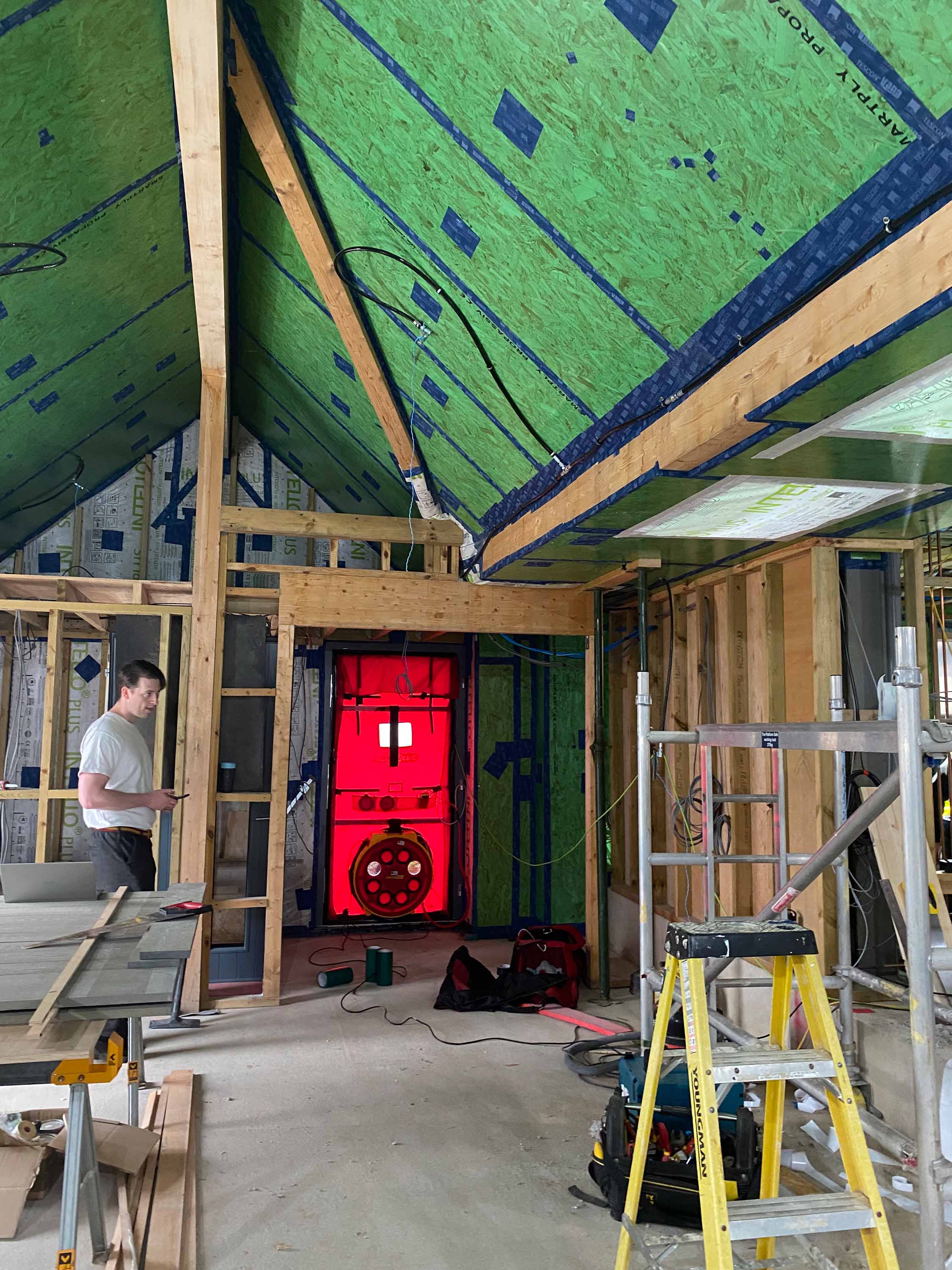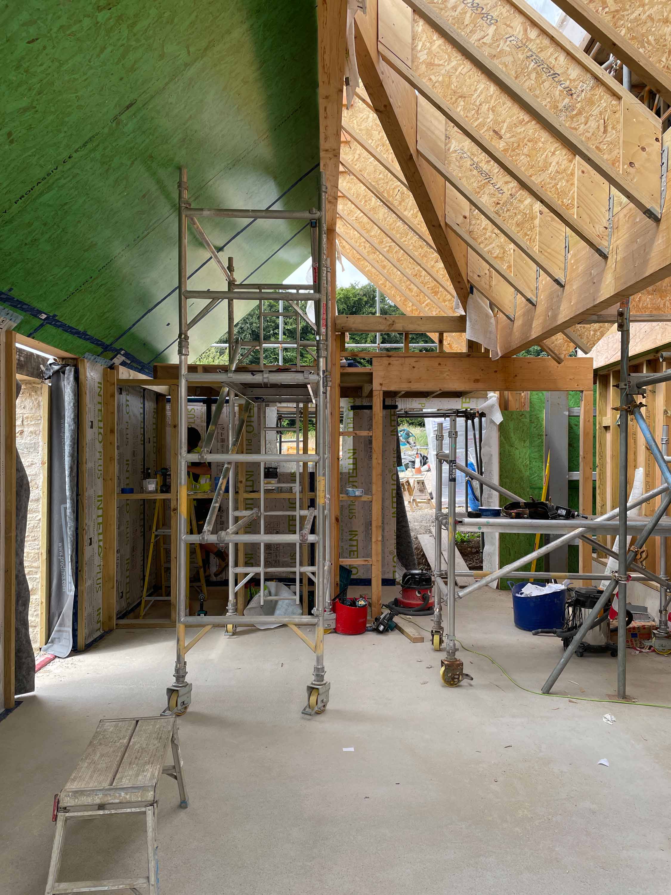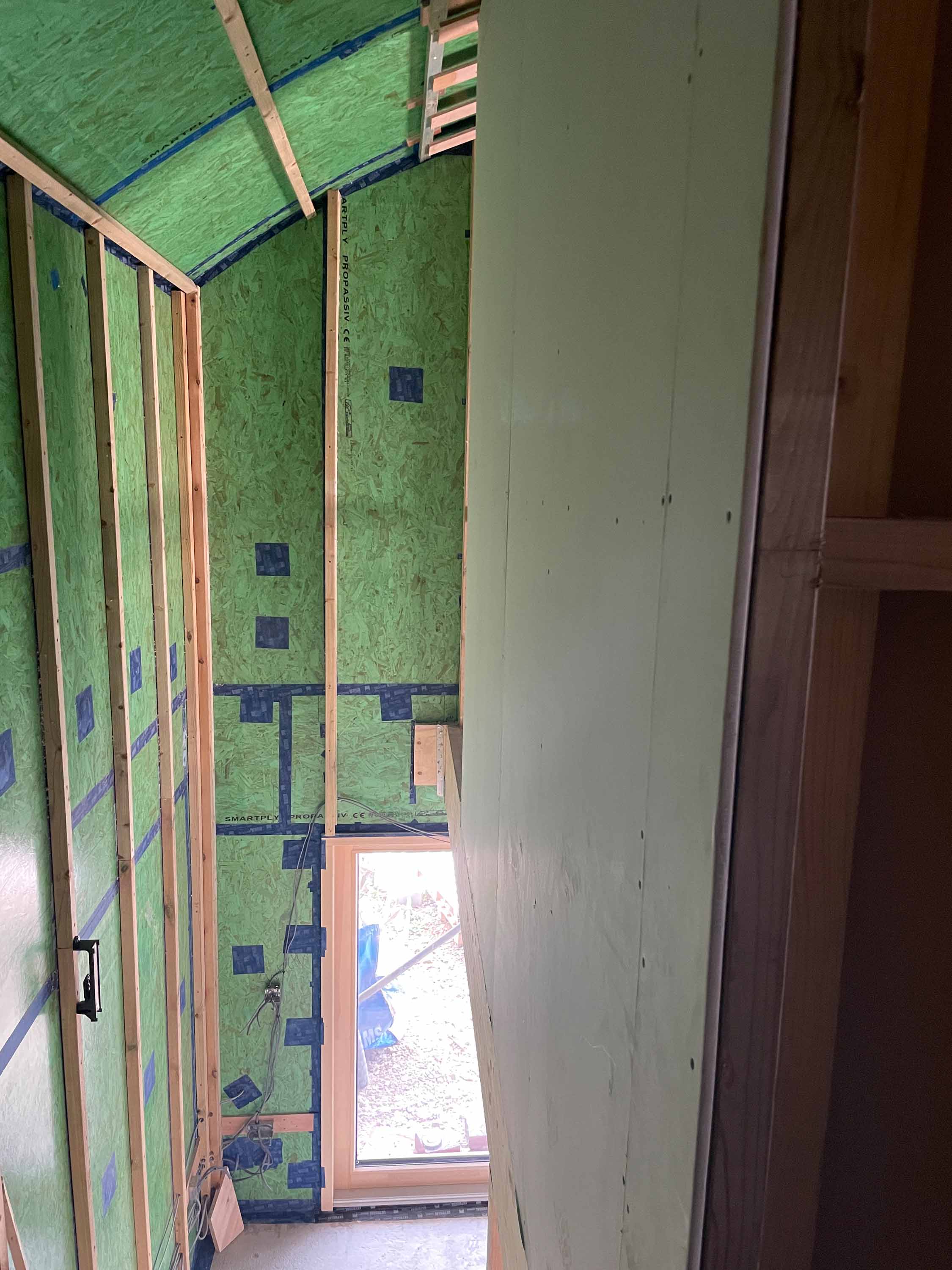 Care was taken to ensure airtightness where the roof timbers connected with the walls, such as an Intello airtight sock on the ridge beam