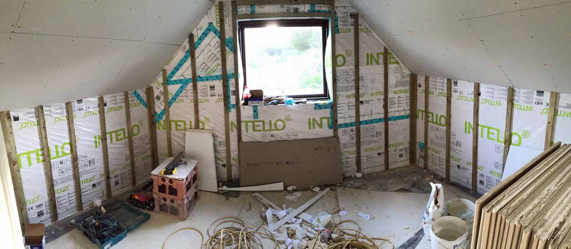 50 mm PIR on slope, airtight layer to all surfaces and 50 mm insulated plasterboard to inside face of pitch and ceiling