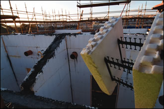 All units are built using Reward Struct-sure's insulating concrete forms (aboveand below). The finished product comprises a central wall of concrete sandwiched either side by polystyrene sheeting. The building block is made from two 65mm expanded polystyrene sheets held together by a reinforced plastic rib which does the job of the conventional cross tie.