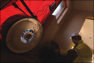 Darrian O'Donoghue of ODM Mechanical and Electrical Engineers conducting a blower door test to check the building's airtightness