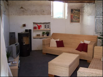 Living area with solid fuel stove (in this image the stove pipe flue had not been fitted), and high level window, originally loft door, which draws morning light from the east