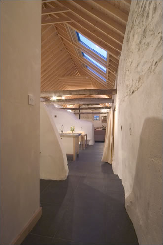 The space available could have generated two units of accommodation, but we realised that such a high intensity use would all-but conceal the original building form. We opted for a gentler approach, using the four stepped zones, each with its wide, low door, to keep the rhythm and identity of the original and where the stall divisions were in stone, to maintain them in place. The roof was beyond repair and we reluctantly replaced it with a substitute which was a replica of the original. We used Actis, a very thin multi-reflective insulation solution, above timber tongue & groove boarding, to ensure that the original roof line was maintained as closely as possible. The walls, 600mm thick stone, built from the ground without foundations and with a dry clay mortar, were lime-painted inside, with an original clay based plaster in some places and a relatively recent hard cement lining up to just above the height of a cow’s backside to facilitate washing down after milking. We decided not to insulate the walls internally as this would have removed the diverse evidence of earlier use and the lovely textures of unplastered stone and plain cement. This was a necessary compromise between building conservation and energy conservation issues, but the only one from which we consciously exempted ourselves.
